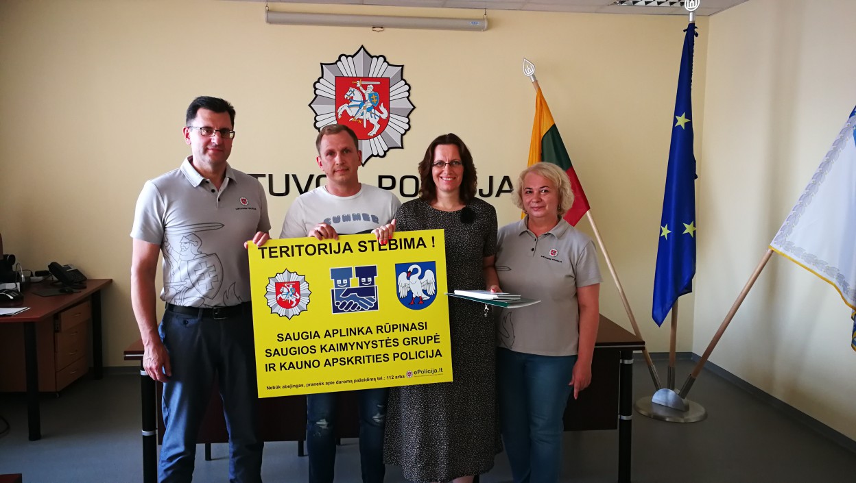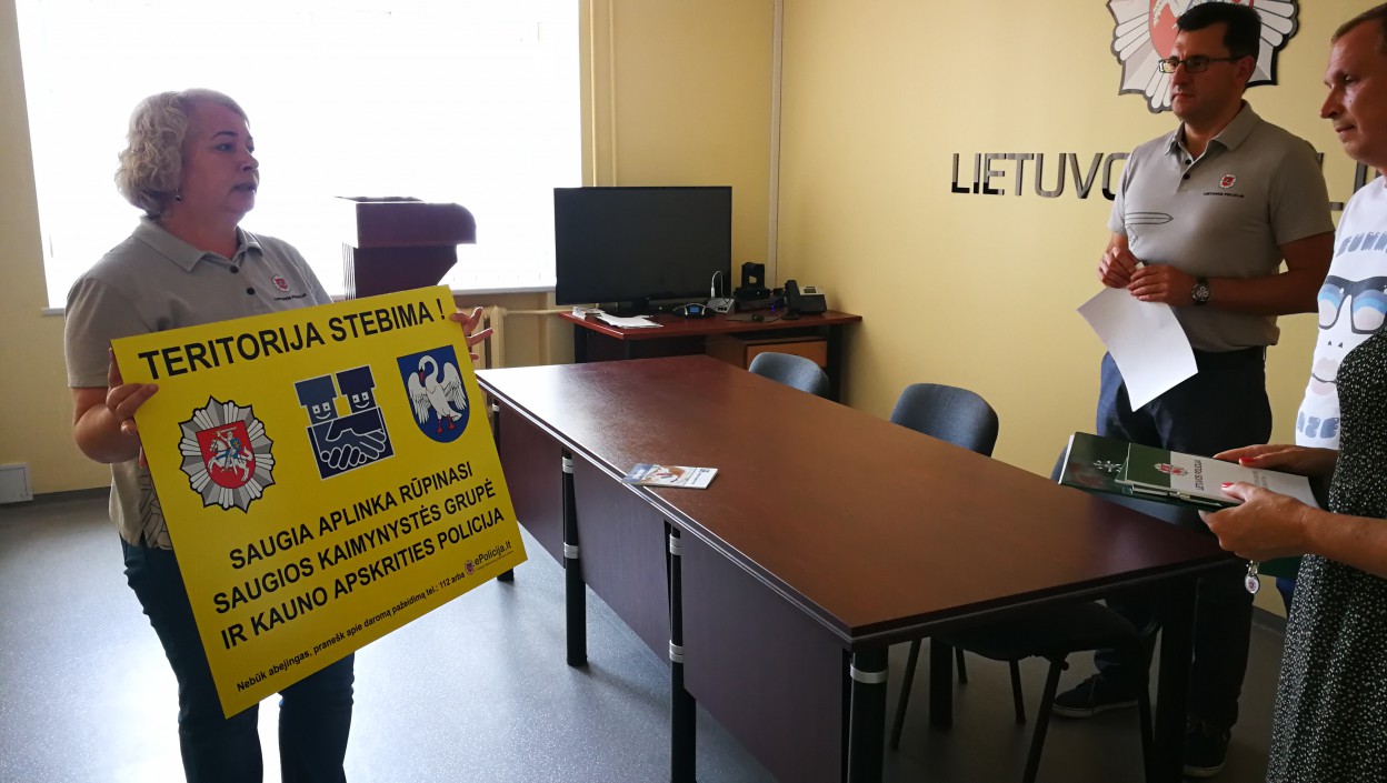 Šiandien naujai Saugios kaimynystės grupei įteikti policijos suvenyrai, informaciniai lankstinukai ir svarbiausia, SKG ženklas, kuris bus pritvirtintas pasirinktoje vietoje bei informuos aplinkinius, kad ši teritorija yra saugi visų kaimynų bendromis pastangomis.