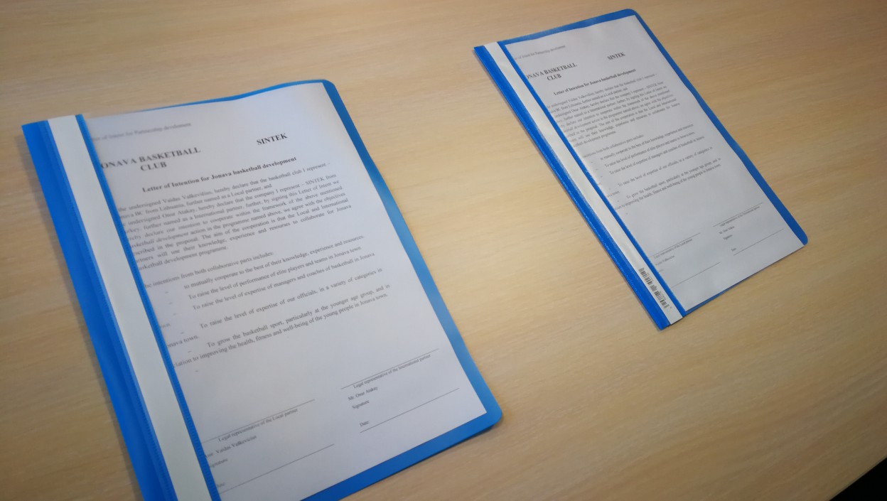 Bendradarbiavimo memorandumą savo parašais patvirtino Turkijos kompanijos „Sintek“ atstovas Onoras Atakay ir Jonavos sporto klubo atstovas Tadas Laucius.