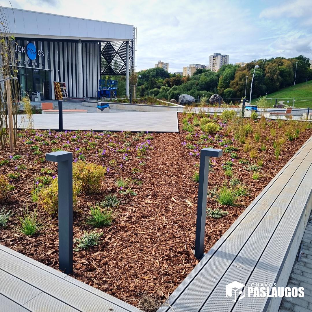 Bendradarbiaujant su baseiną statančia įmone dėl aplinkos apželdinimo, UAB ,,Jonavos paslaugos“ suprojektavo bei įrengė baseino prieigose esančius gėlynus.