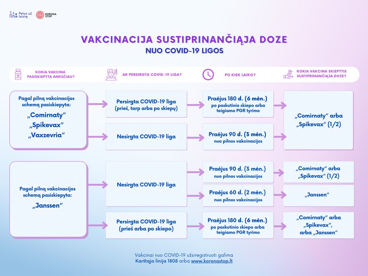 Pasirinkti vakciną ir sustiprinančiajai dozei tinkamą laiką padės schema nuotraukų galerijoje.
