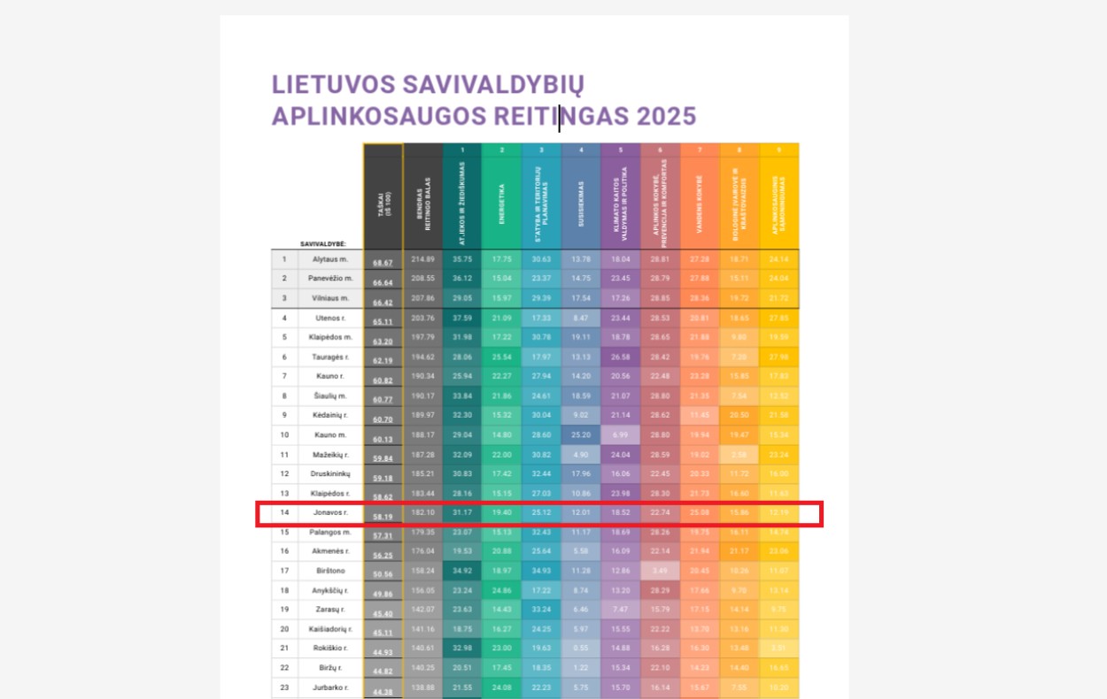 Nors Jonava šiemet nepateko tarp dešimties lyderių, jos rezultatai rodo nuoseklų progresą aplinkosaugos srityje, o pasiekta 14 vieta – tvirtas įrodymas, kad savivaldybė juda teisinga kryptimi siekdama peržengti 80 balų ribą ateityje.