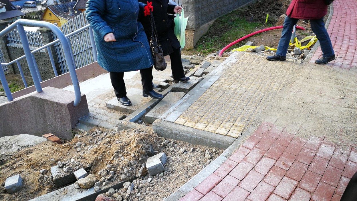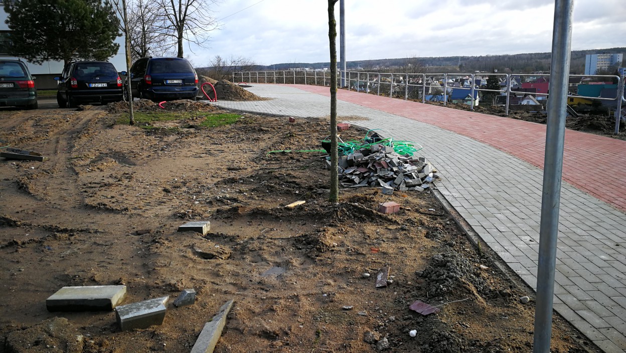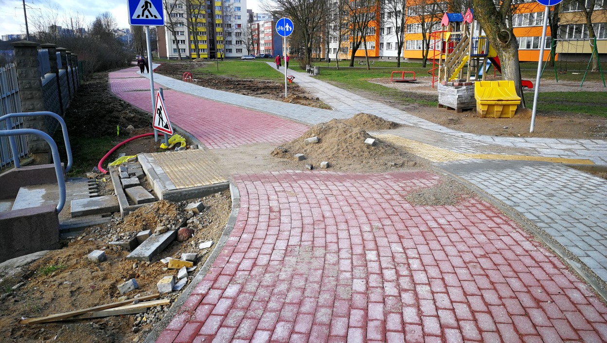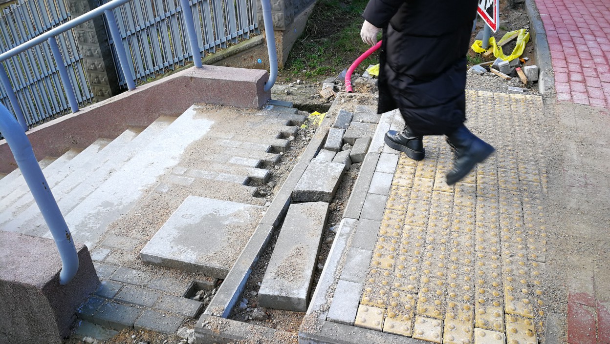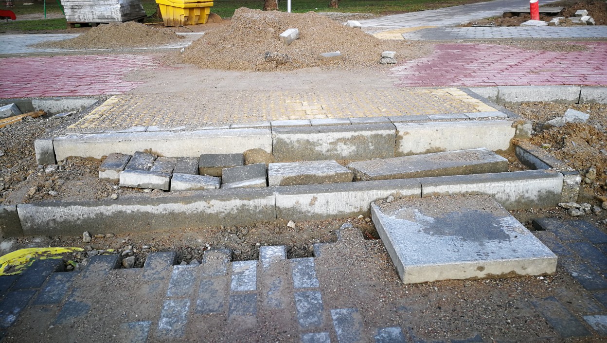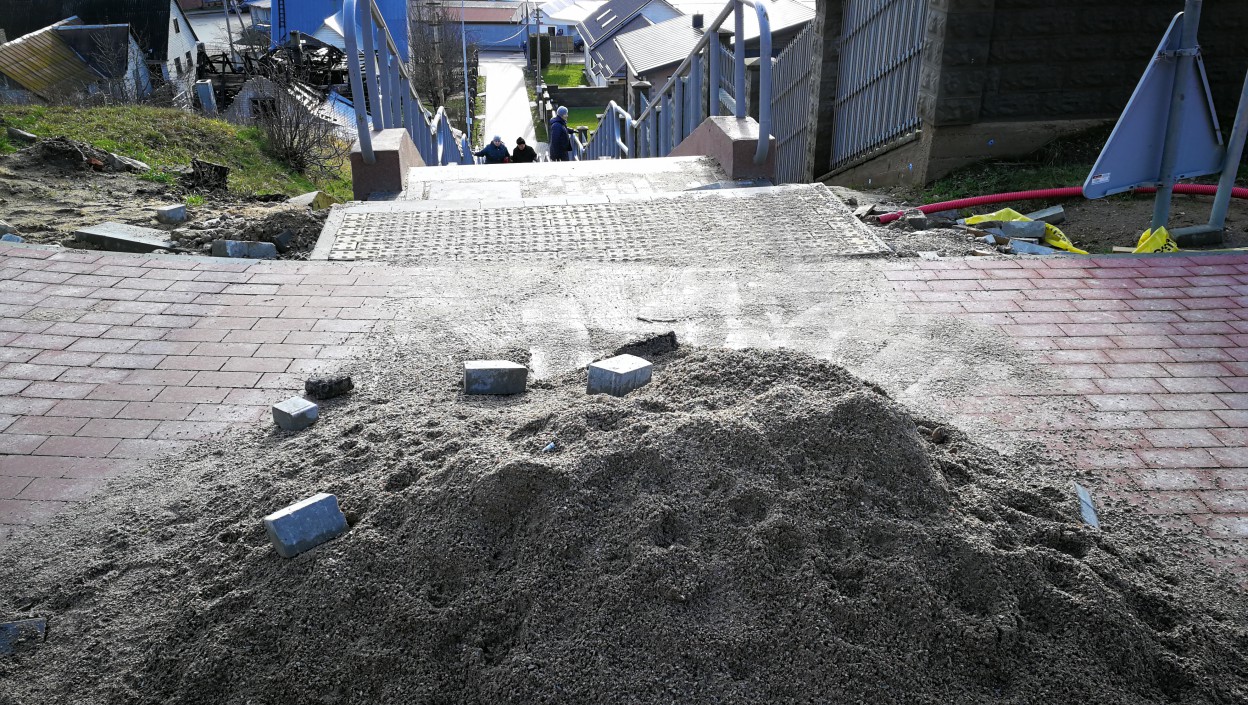 Ties Kosmonautų g. esančiais laiptais į turgų, naujai tiesiamame dviračių pėsčiųjų take – tikra netvarka: bet kaip pabertas smėlis, išmėtytos trinkelės, šiukšlės, ties laiptų pakopa žiojėja skylės, svyrantys betoniniai kelkraščiai.