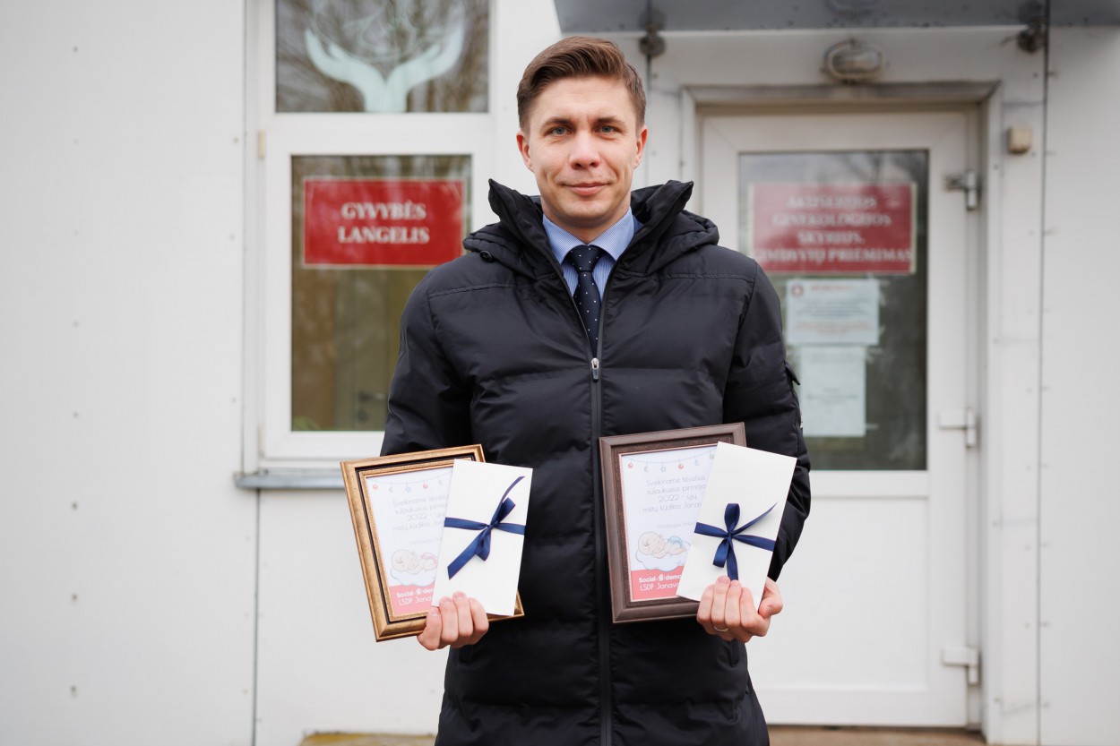 Jonavos rajono meras, LSDP Jonavos skyriaus pirmininkas Mindaugas Sinkevičius abiems kūdikiams perdavė dovanų, o mamas pasveikino gėlių puokštėmis.