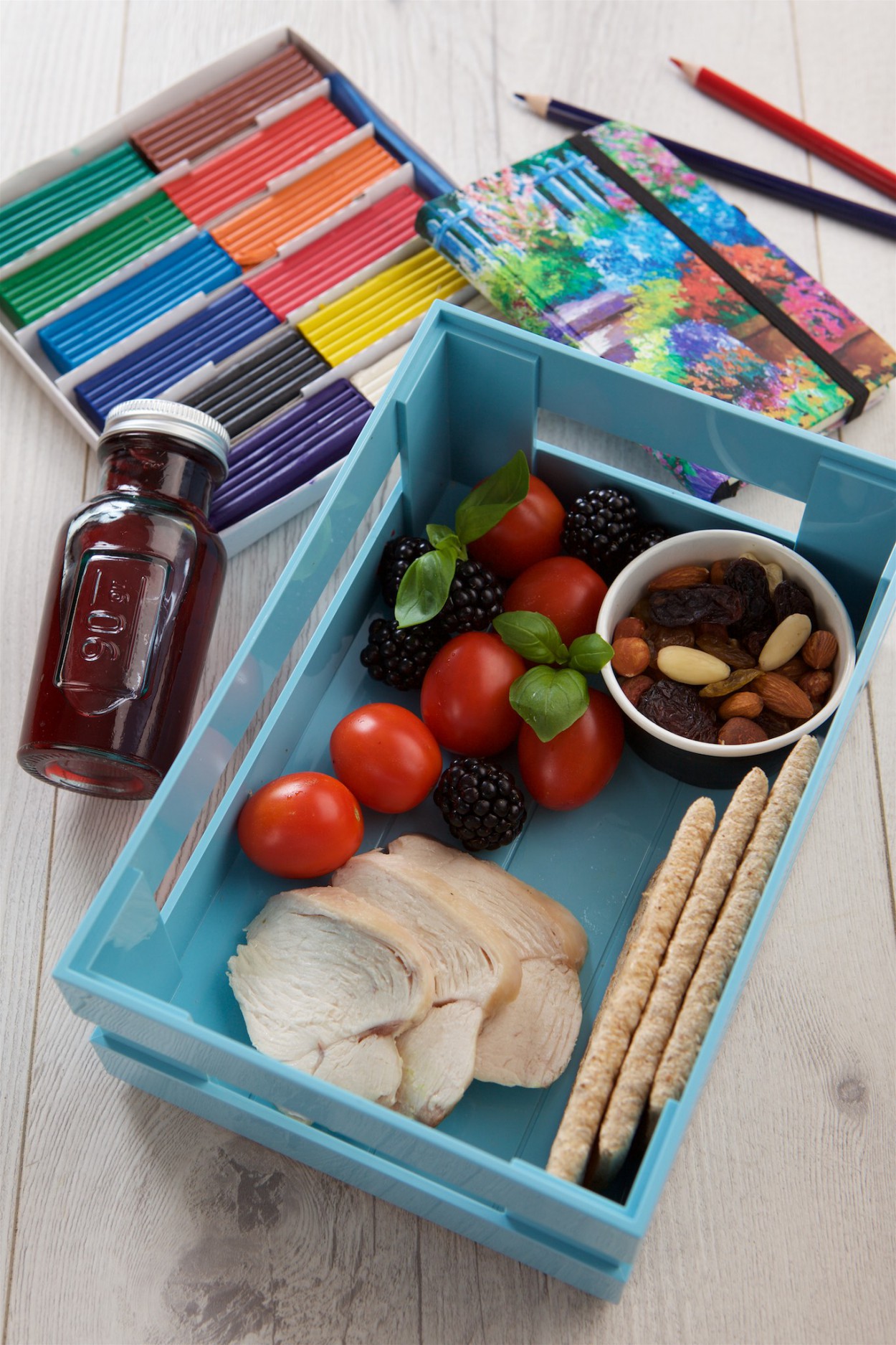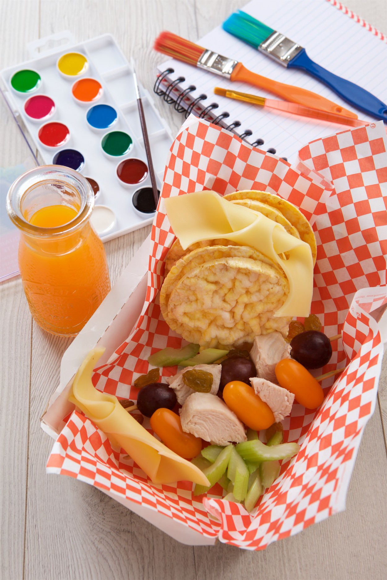 Vištienos filė kepame alyvuogių aliejuje. Iškeptą atvėsiname ir supjaustome kubeliais. Vištieną veriame ant iešmelio kartu su vynuoge ir pomidorais. Į priešpiečių dėžutę dedame pjaustytus salierų stiebelius, pora riekių sūrio, kukurūzų paplotėlius ir razinas.