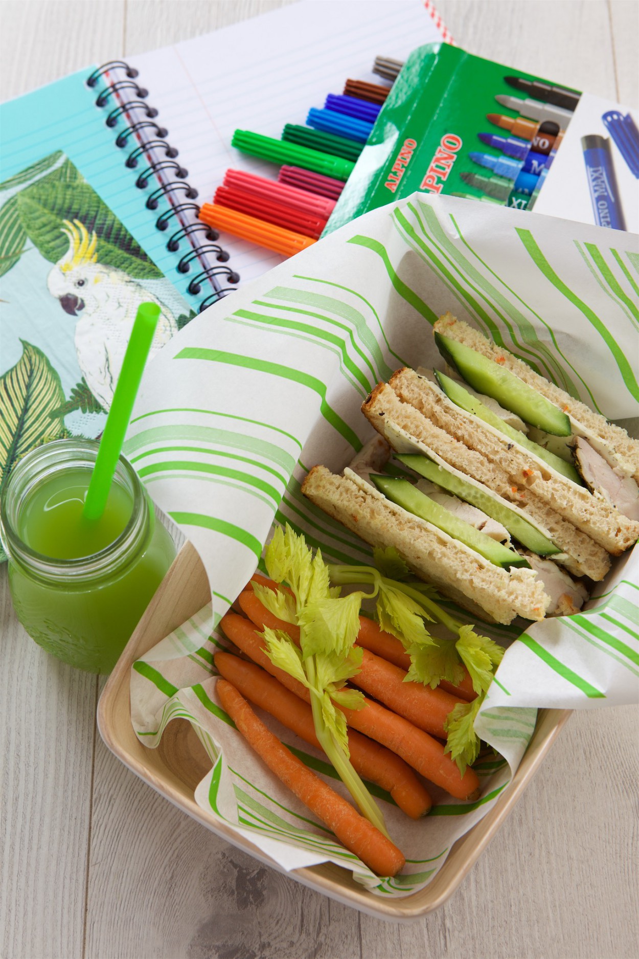 Vištieną iškepame alyvuogių aliejuje, atvėsiname. Ant duonos riekės tepame sūrį, dedame keptą vištienos šlaunelių mėsą, daržoves ir apteptą sūriu antrąją duonos riekę. Perpjauname per pusę įstrižai. Į priešpiečių dėžutę dedame suvožtinius ir mini morkas.