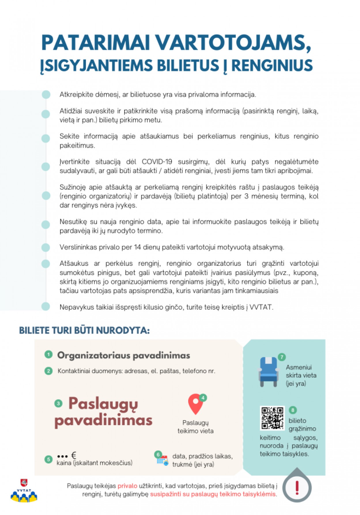 - Atkreipiame dėmesį, kad reikia kreiptis ne tik į bilietų pardavėją (platintoją), bet ir į renginio organizatorių, kadangi bilietuose dažniausiai nurodoma, jog atsakomybė už neįvykusį renginį ar už nekokybišką renginį tenka organizatoriui;