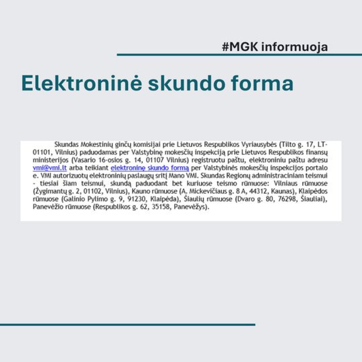 Tobulėjant skaitmenizavimui ir informacinėms technologijoms, mokesčių mokėtojams sudaromos patogesnės sąlygos greitai ir paprastai pateikti skundus dėl Valstybinės mokesčių inspekcijos (VMI) priimtų sprendimų. Nuo 2024 m. Mokestinių ginčų komisija (Komisija) kartu su VMI įgyvendina iniciatyvą, skirtą supaprastinti skundo pateikimo formą ir sumažinti administracinę naštą mokesčių mokėtojams.