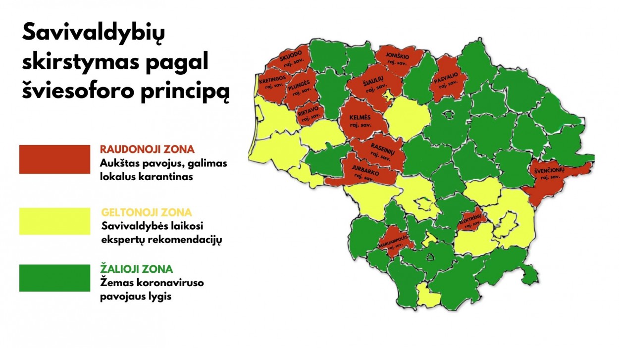 Atsižvelgdama į tarptautinių organizacijų rekomendacijas, trečiadienio posėdyje Vyriausybė pritarė savivaldybių skirstymui į tris zonas pagal epidemiologinius rodiklius – geltoną, žalią ir raudoną. Į raudoną zoną patekusiose savivaldybėse, siekiant suvaldyti koronaviruso (COVID-19) plitimą, galės būti skelbiamas vietinis karantinas, ribojama gyventojų veikla.
