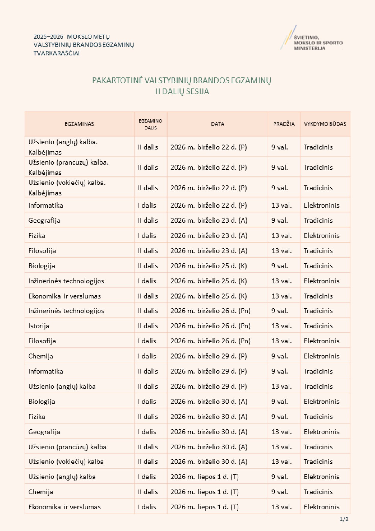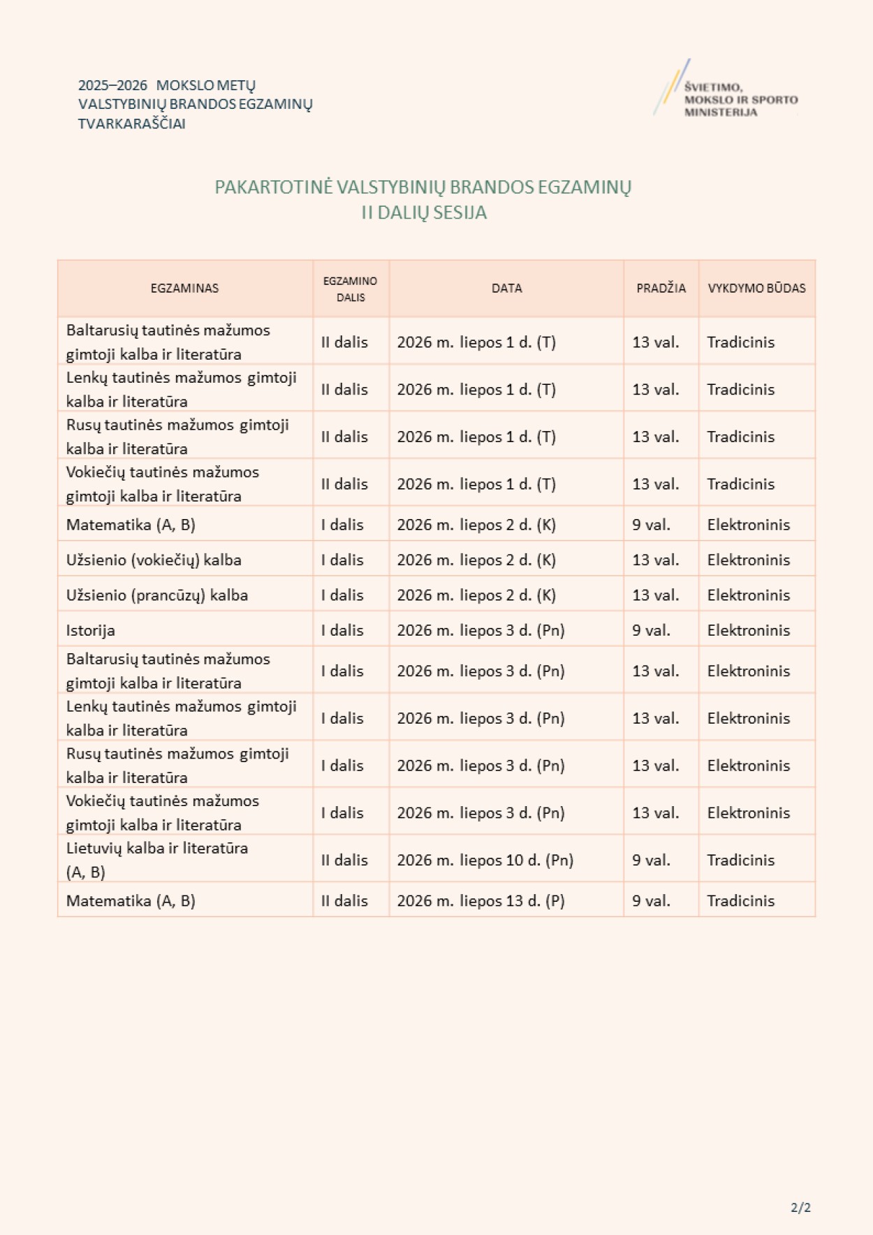 Pakartotinė VBE sesija numatyta nuo 2026 m. birželio 22 d. iki 2026 m. liepos 13 d.