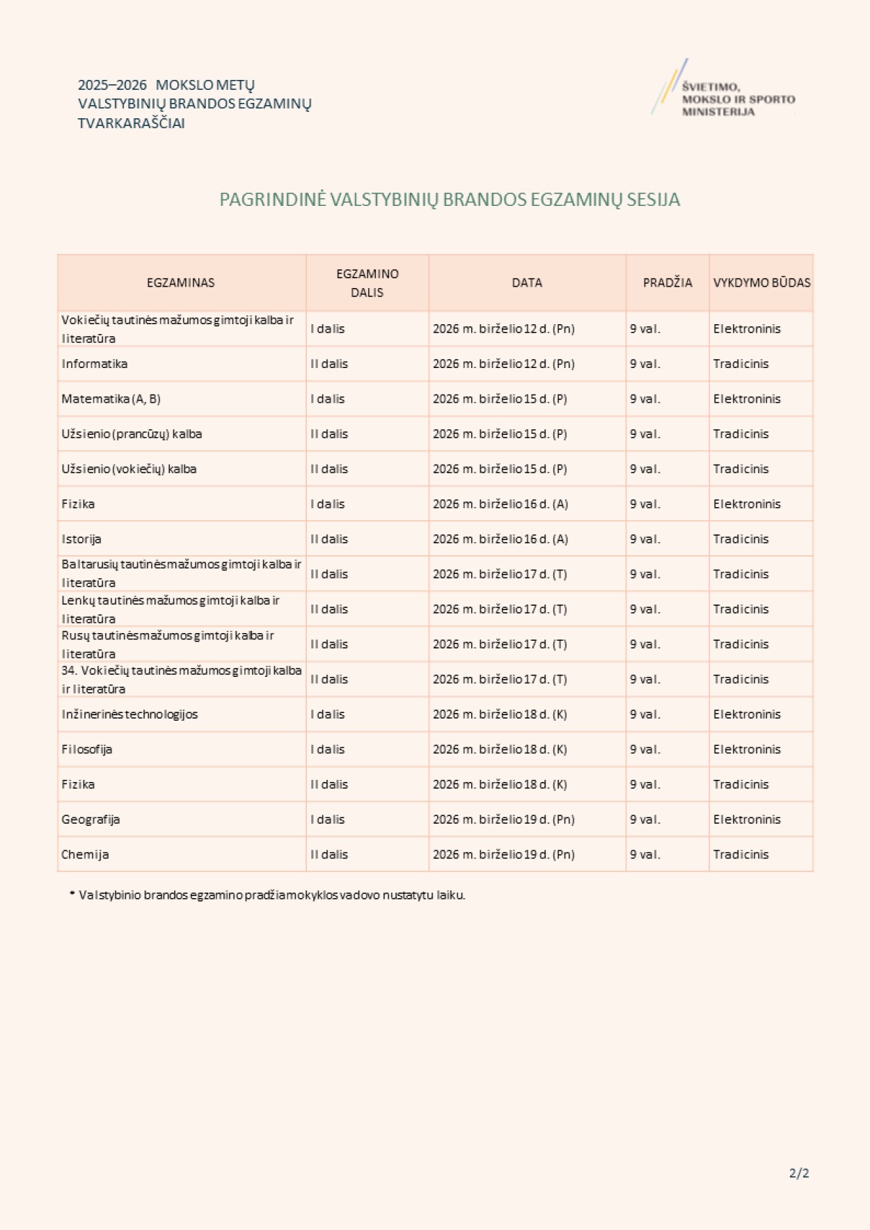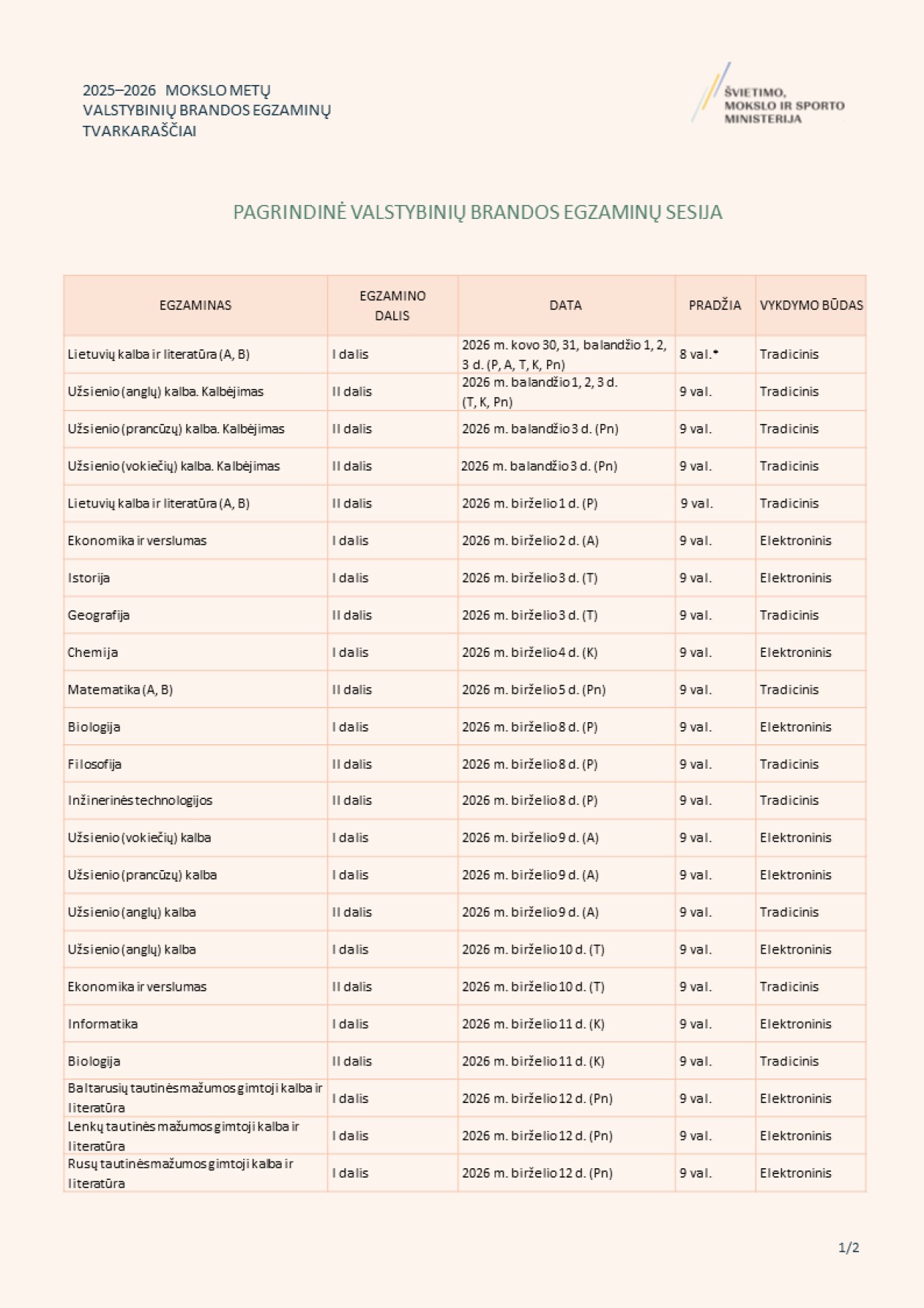 Švietimo, mokslo ir sporto ministrė Raminta Popovienė patvirtino 2025–2026 m. m. valstybinių brandos egzaminų (VBE) tvarkaraščius.