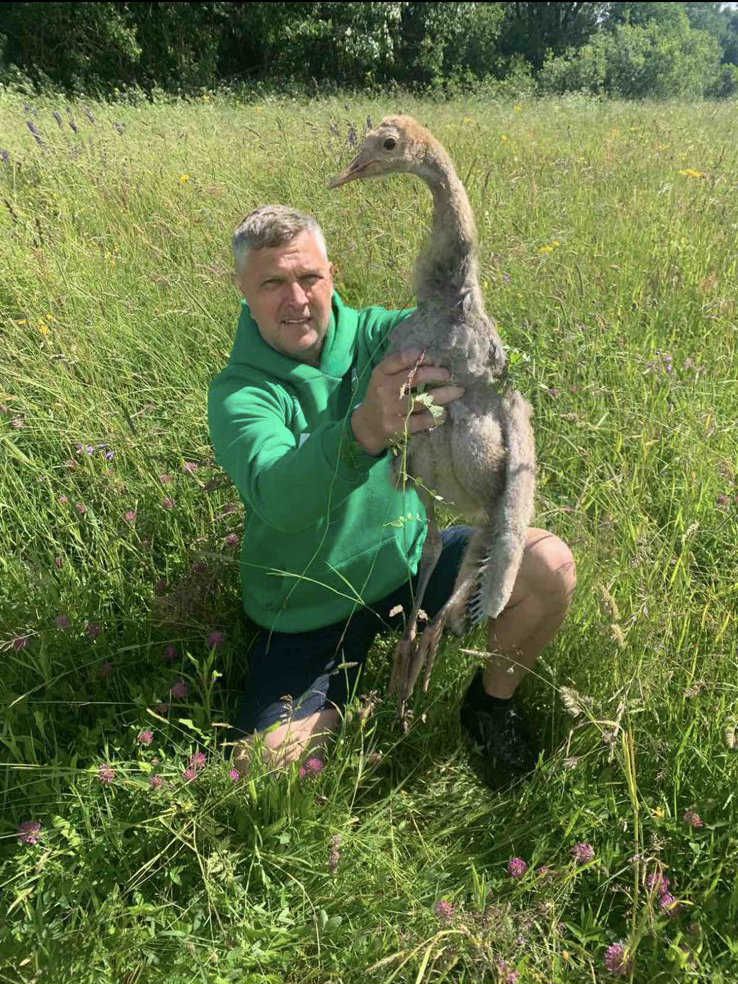 Įsimintinas momentas, kai tauragiškiui pavyko pagauti ir sužieduoti pilkosios gervės jauniklį. A. Katkaus asmeninio albumo nuotr.