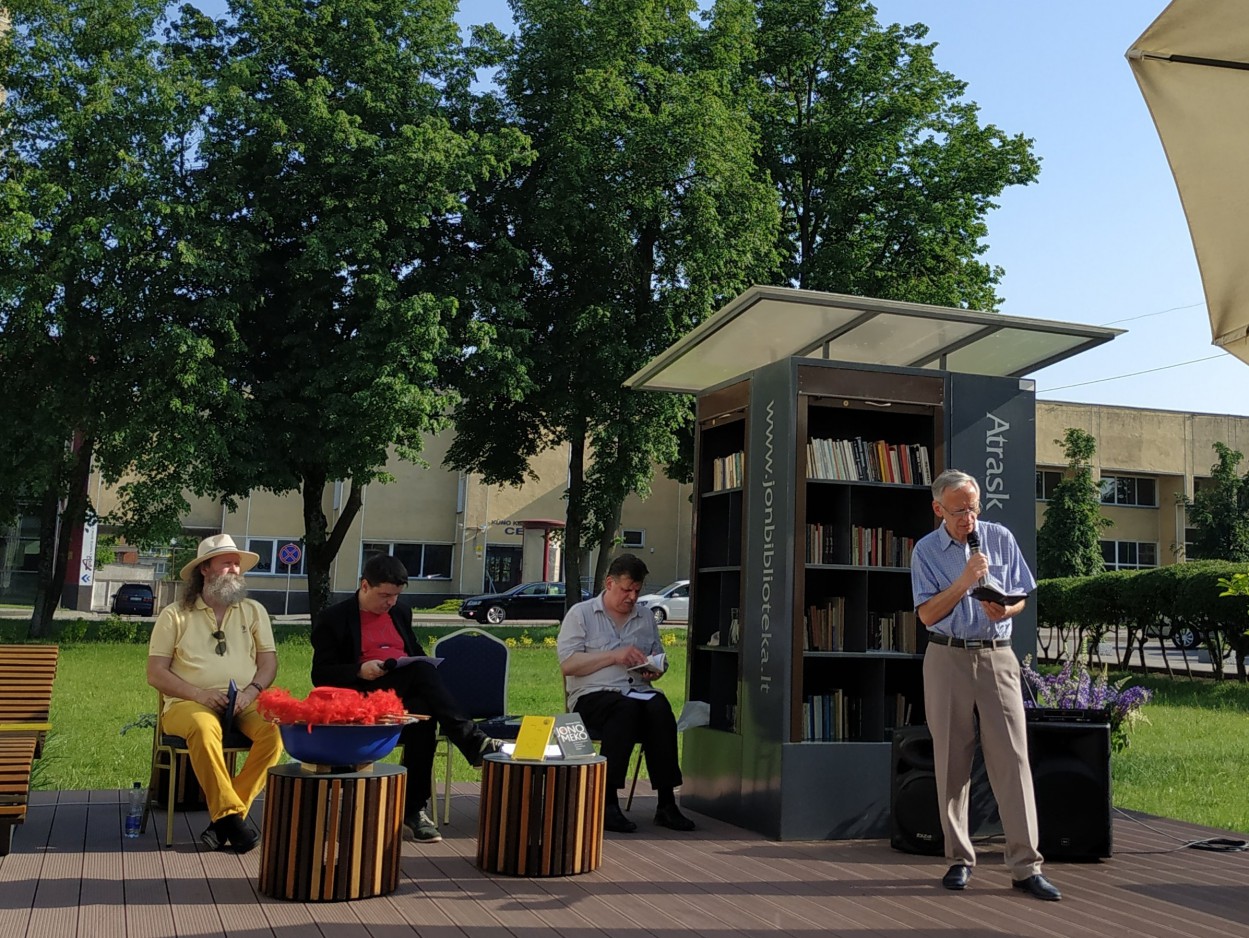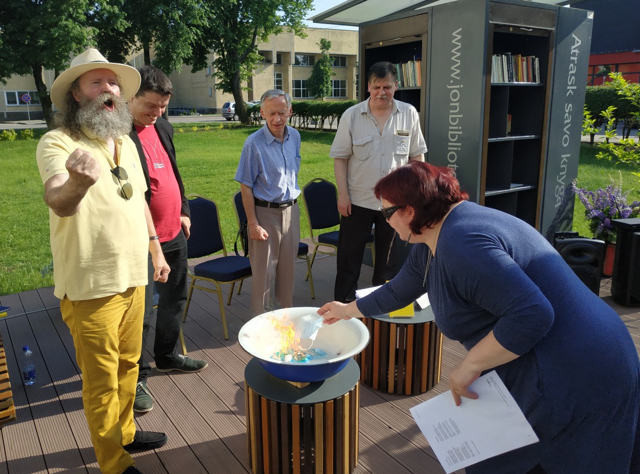 Pavasario blūdo kaltininkai ir iniciatoriai gerai pažįstami jonaviečiams. Ramūnas Čičelis, Mindaugas Švėgžda, Marius Glinskas ir Feliksas Paulauskas - prieš trejus metus įkurtos Mirusių poetų draugijos nariai, siejami kūrybinės draugystės ir pasiryžimo kasdienybės rutinoje įkvėpti poezijos tiems, kurie alksta gerų eilėraščių ir intelektualių dalykų. Ir vieno, ir kito, save mirusiais vadinantys poetai, nestokoja. Anaiptol, kviečia atsiversti naujausias knygas: M. Švėgždos eilėraščių rinkinį „Geltona ornamentika“ bei R. Čičelio monografiją „Jono Meko „Aukso vidurys“. Geras kūrybos gurkšnis – ir pirmajame draugijos laikraščio numeryje „Skiautinys“, kurio dar keletą egzempliorių galima rasti Jonavos viešosios bibliotekos skaitykloje.