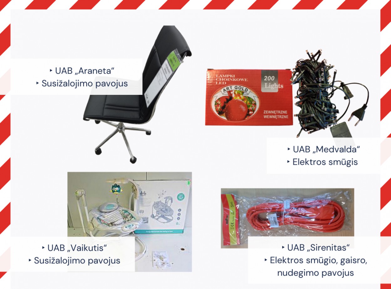 Valstybinė vartotojų teisių apsaugos tarnyba (VVTAT) nustatė nesaugius produktus – sūpuokles, biuro kėdę, kalėdines lemputes ir ilgintuvą. Juos į rinką teikė UAB „Vaikutis“, UAB „Araneta“, UAB „Medvalda“ ir UAB „Sirenitas“.