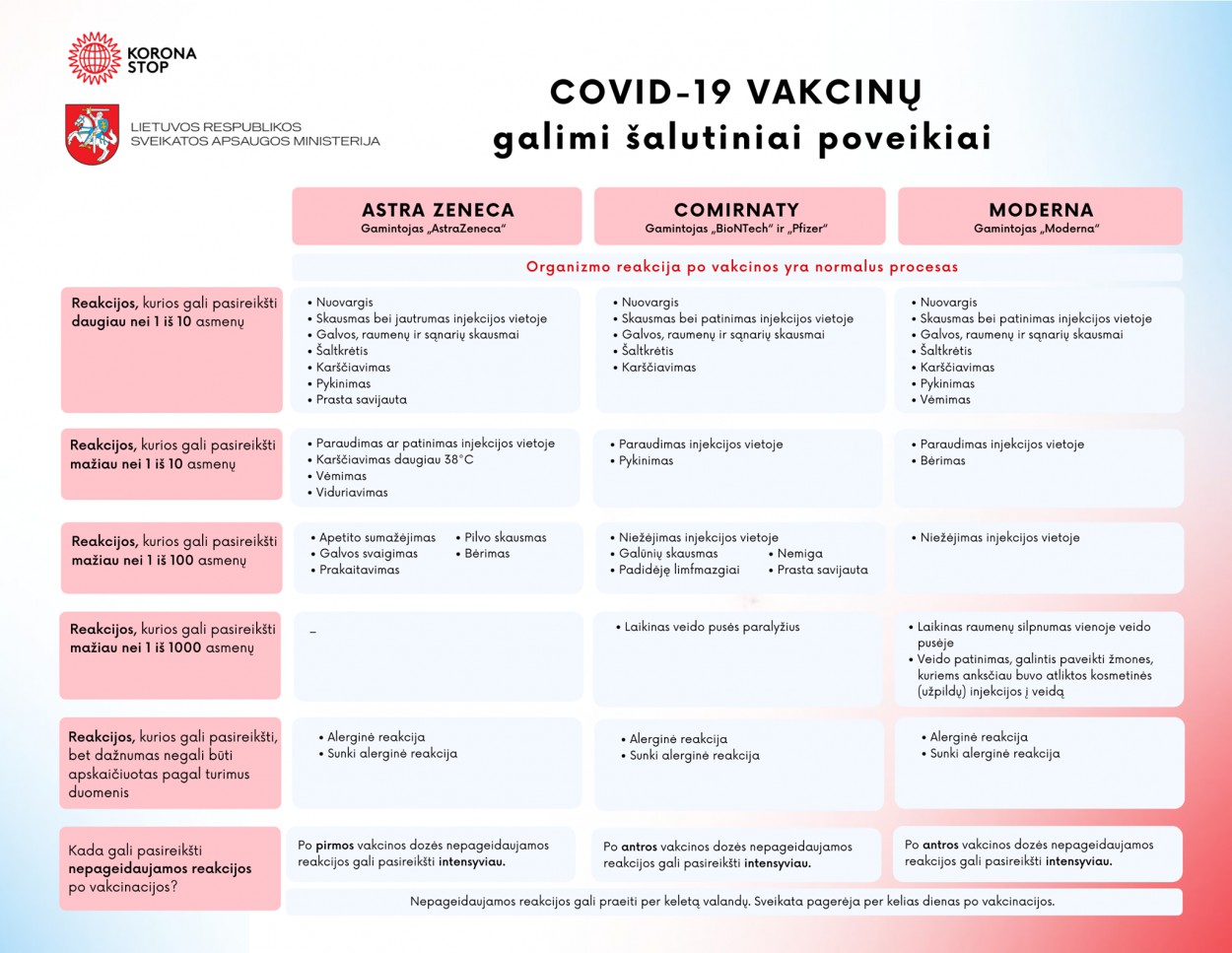 Pagrindiniai nuo COVID-19 ligos paskiepytų žmonių pranešimai, kurių sulaukė Tarnyba, tai – karščiavimas, galvos skausmas, raumenų skausmas, pykinimas injekcijos vietos reakcijos. Dažniausiais šios reakcijos buvo lengvos arba vidutinio sunkumo ir praeidavo po kelių dienų.