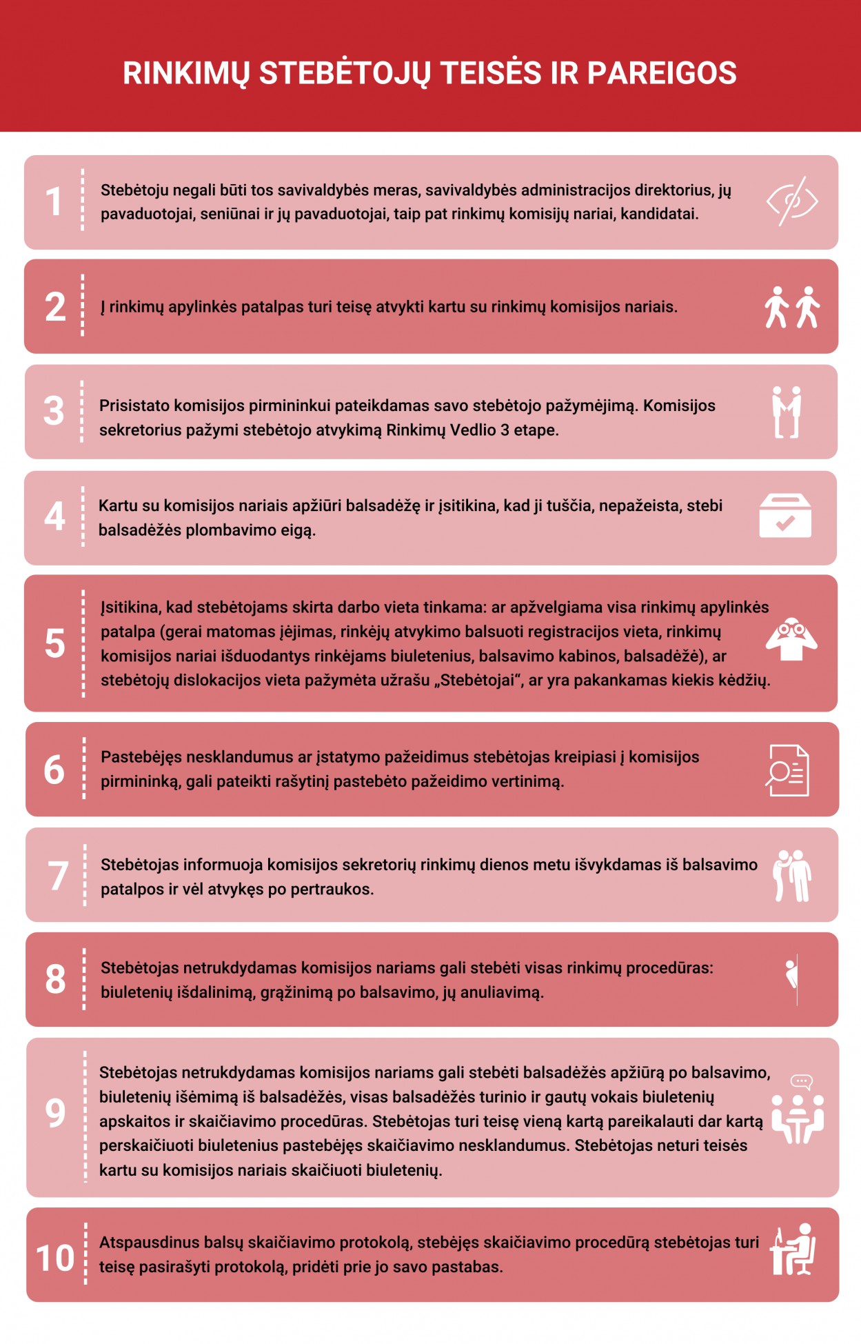 Plačiau apie rinkimų stebėtojų registravimo tvarką ir stebėtojų funkcijas skaitykite Rinkimų (referendumo) stebėtojų registravimo tvarkos apraše.