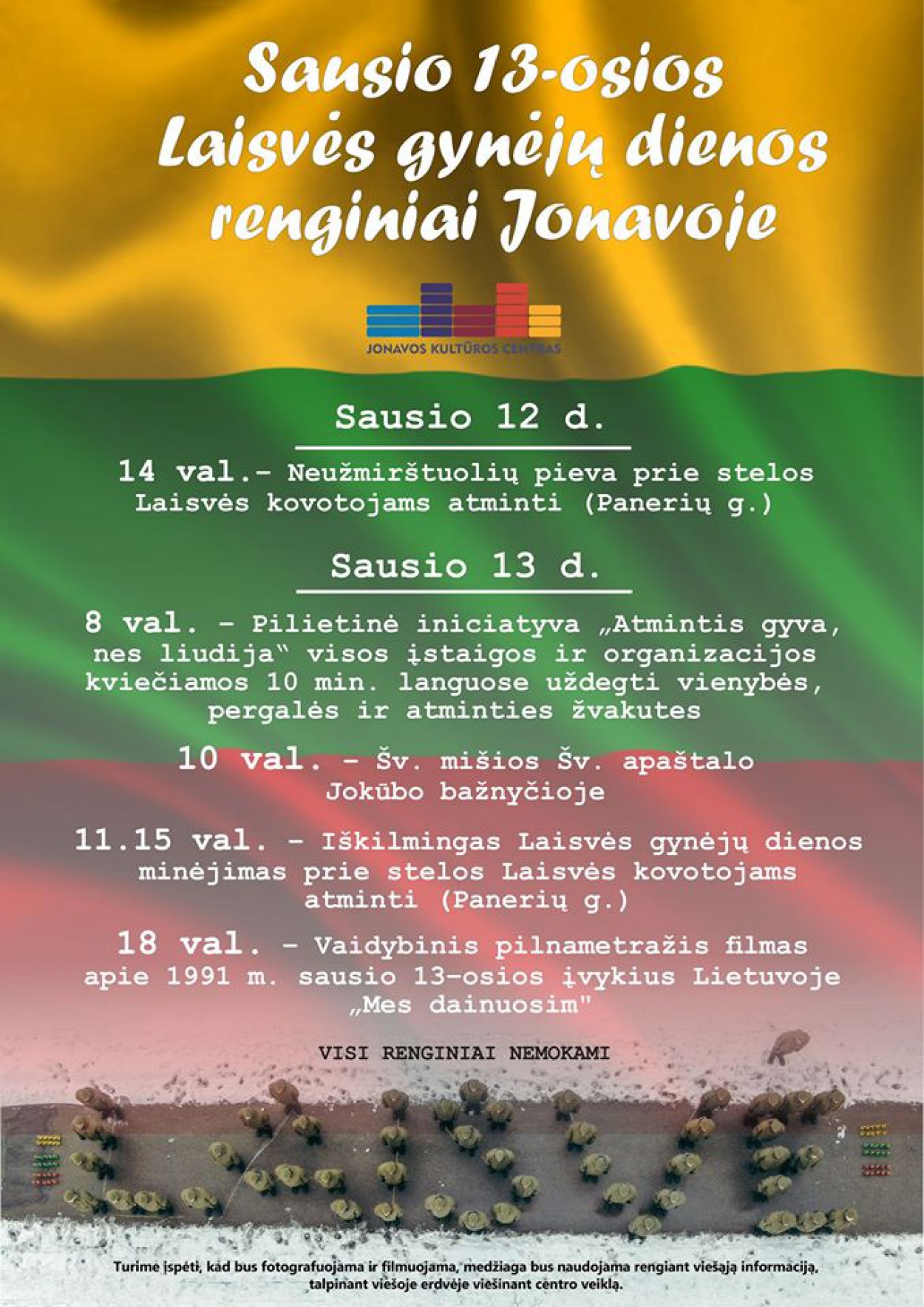 Sausio 13 d. 8 val. Pilietinė iniciatyva „Atmintis gyva, nes liudija“ - visos įstaigos ir organizacijos kviečiamos 10 min languosi uždegti vienybės, pergalės ir atminties žvakutes.