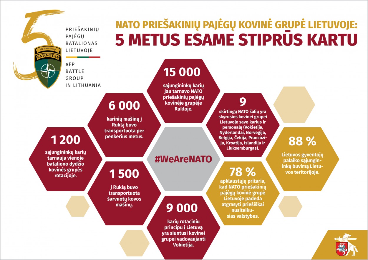 Pirmasis NATO priešakinių pajėgų Lietuvoje vadas tvirtina, kad sąjungininkų kariai į Lietuvą su džiaugsmu vyksta ne tik dėl infrastruktūros, bet ir dėl lietuvių palaikymo. Gruodį atliktos apklausos duomenimis Lietuvos narystę NATO palankiai vertina 89 proc. šalies gyventojų, o 88 proc. palaiko sąjungininkų buvimą Lietuvos teritorijoje. 78 proc. apklaustųjų pritaria, kad NATO priešakinių pajėgų kovinė grupė Lietuvoje padeda atgrasyti priešiškai nusiteikusias valstybes.