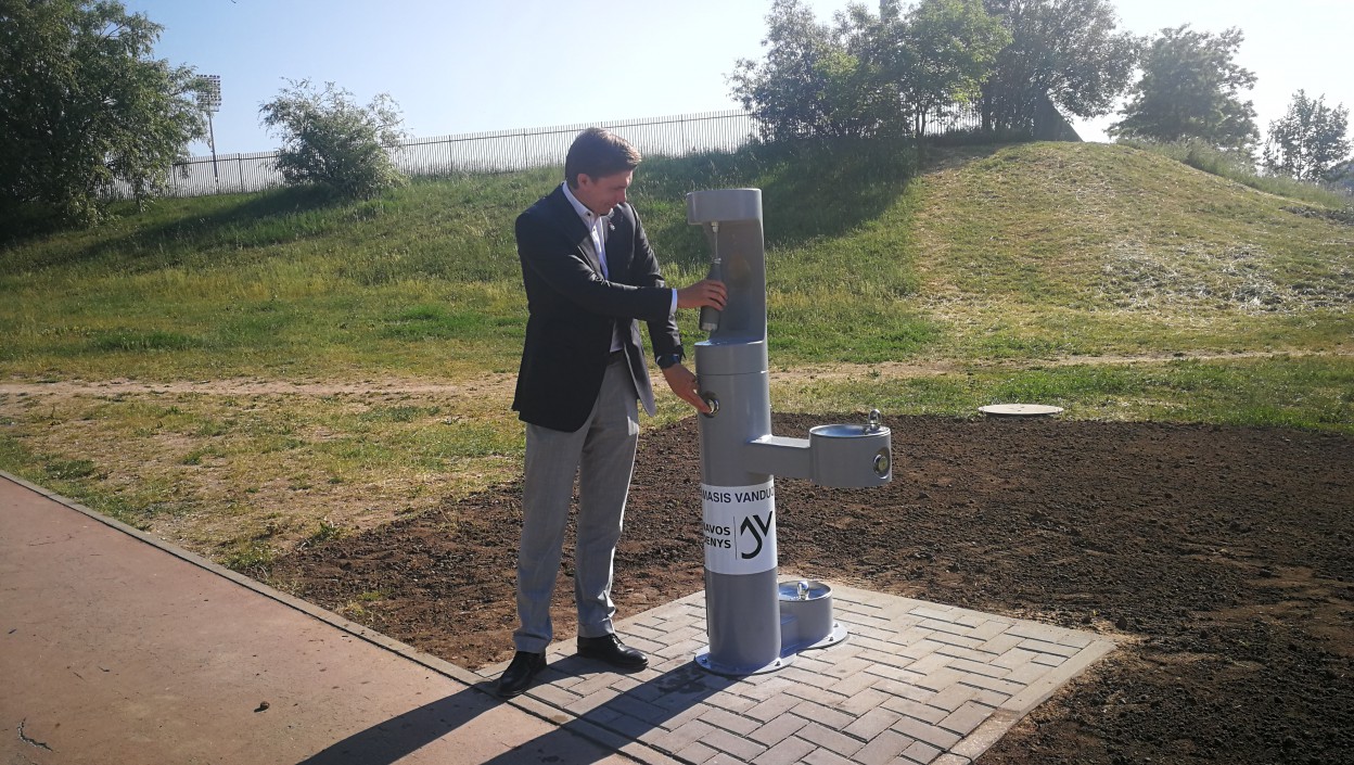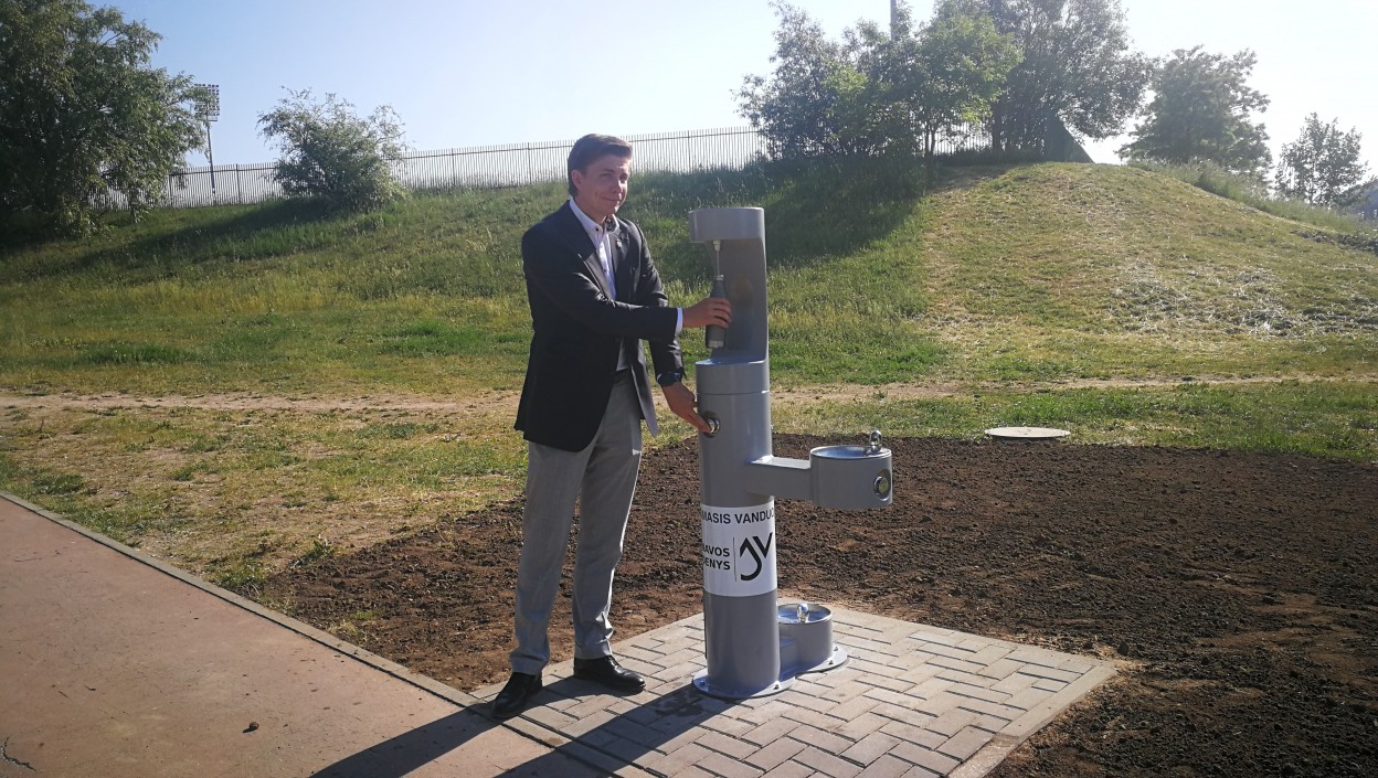Naujos kartos pirmąjį Jonavoje tokį fontanėlį išbandė ir bendrovės „Jonavos vandenys“ direktorius Mindaugas Sinkevičius.