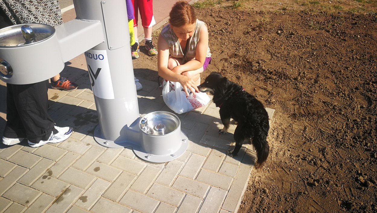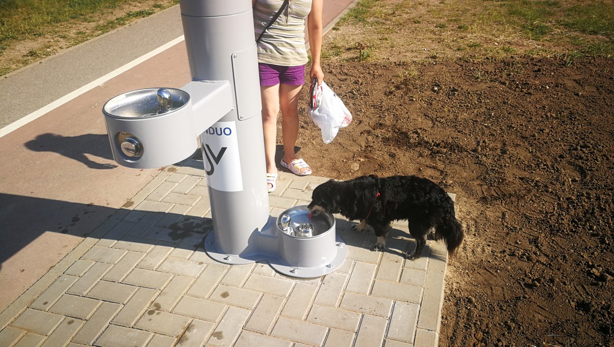 Dviračių pėsčiųjų taku ėjusi moteris su augintiniu taip pat pirmoji išbandė naują paslaugą – pačiame žemiausiame lygyje esantį fontanėlį augintiniams. Nors iš pradžių keturkojis ir nelabai ryžosi lakti, bet vėliau, paragintas šeimininkės – puikiai atsigaivino.