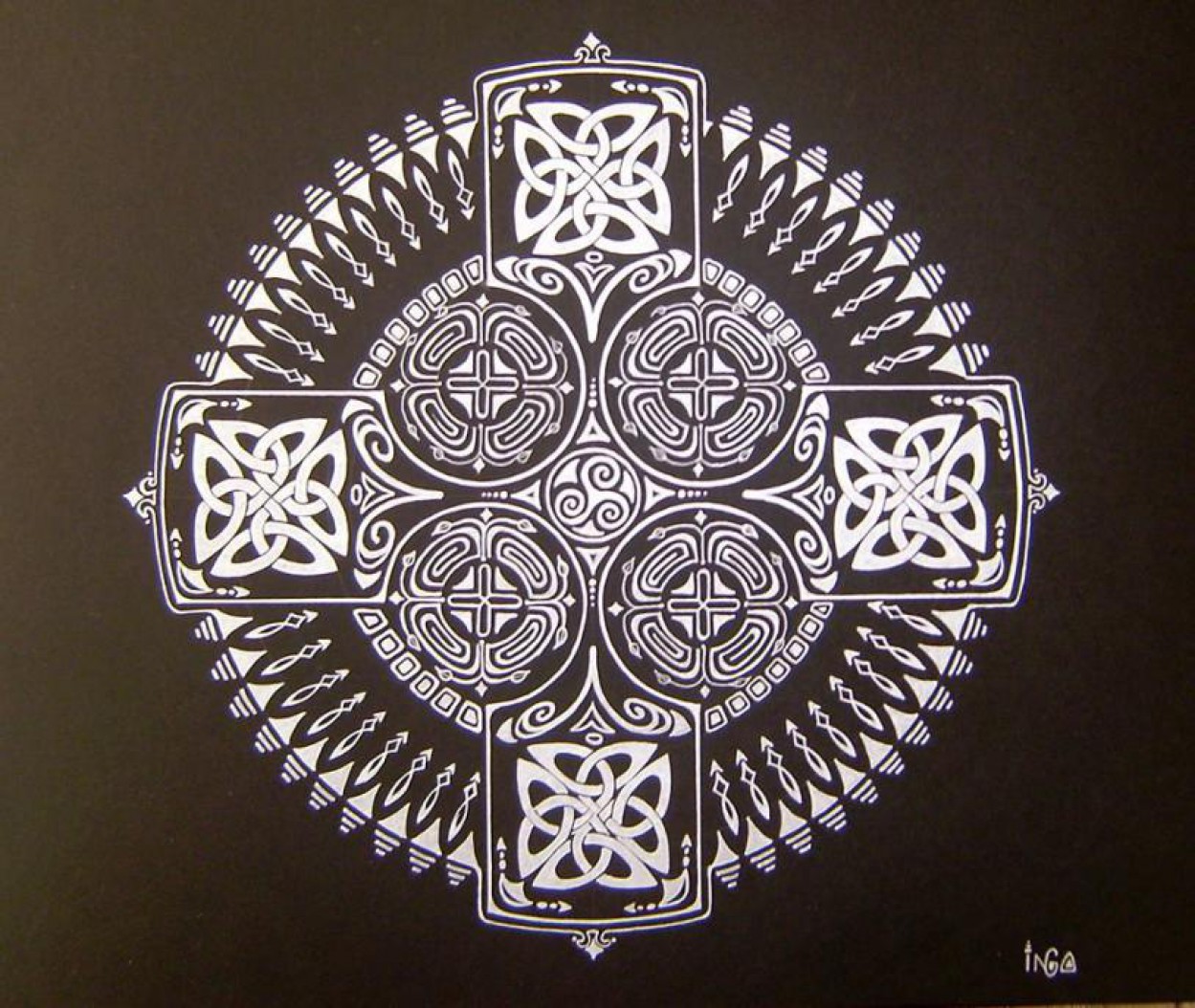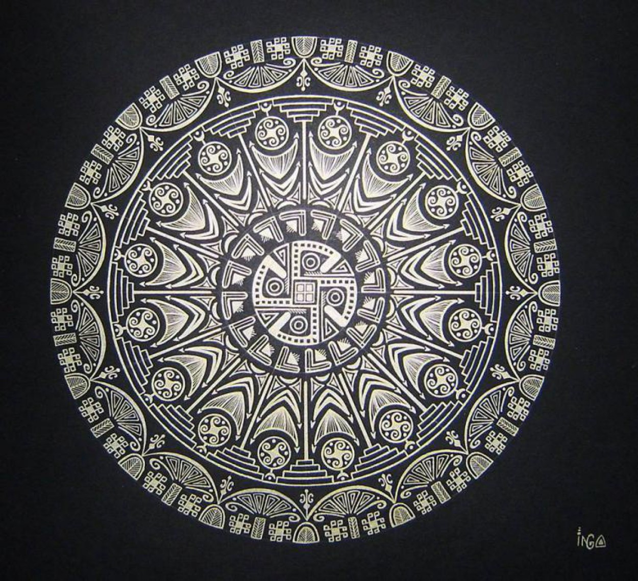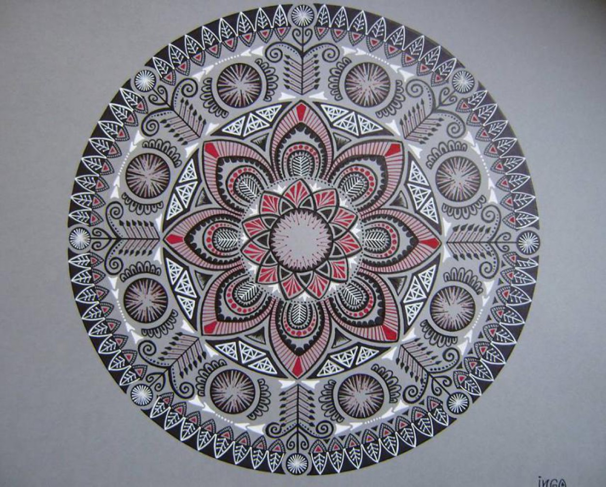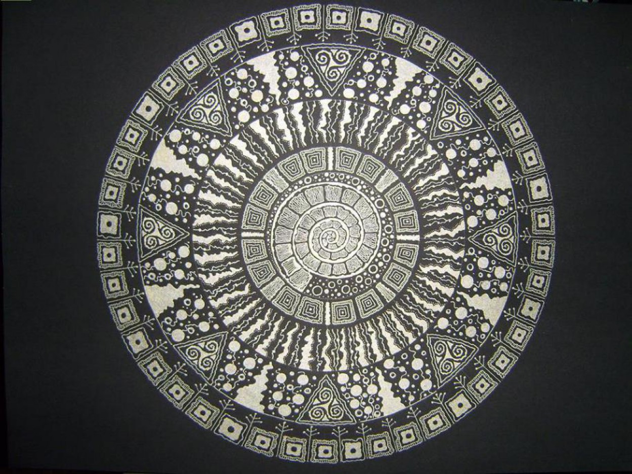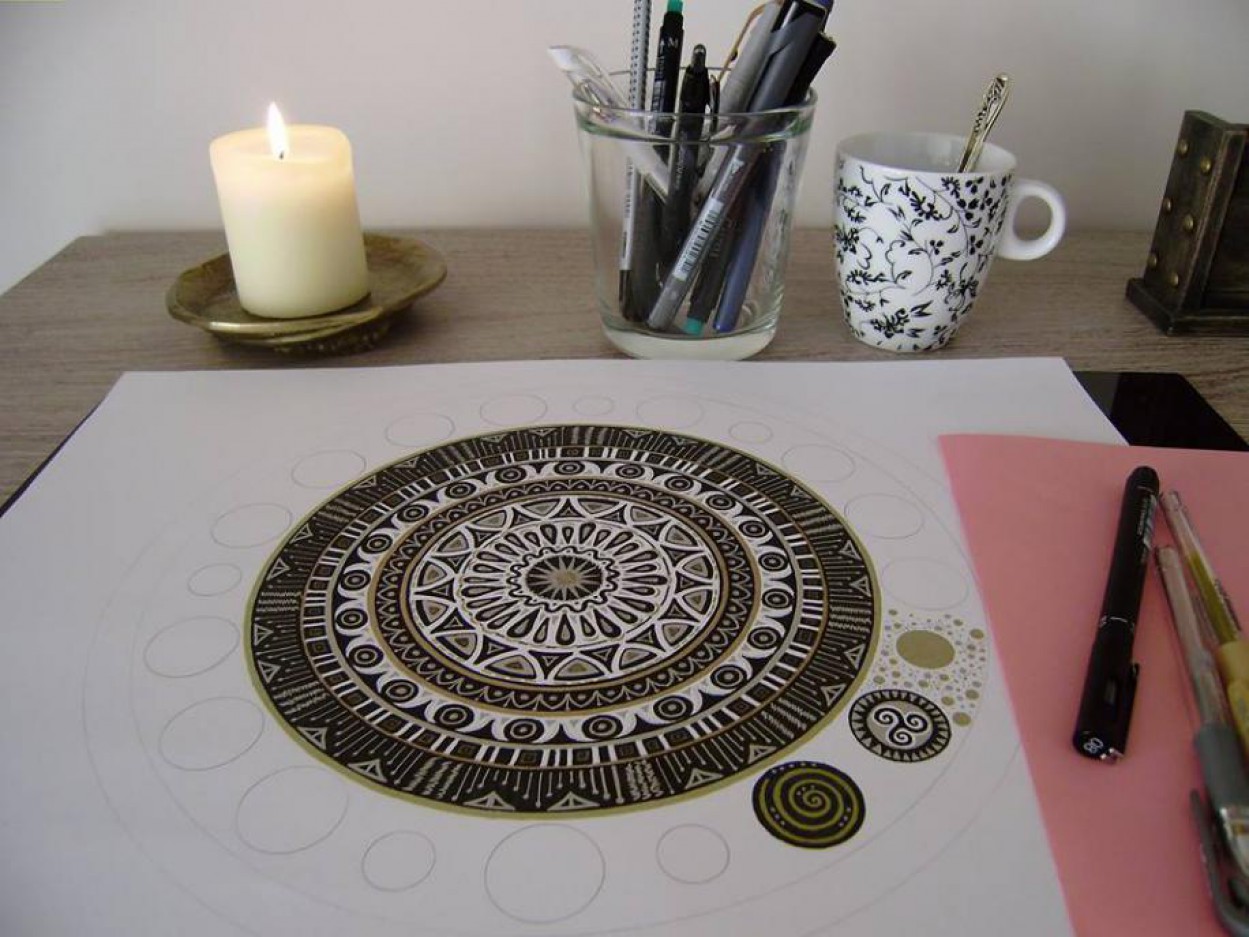 Todėl vieną vakarą pasiėmiau didelę lėkštę, apsibrėžiau apskritimą, pasižymėjau centrą ir pradėjau. Pirmosios mandalos, atrodo, tarsi išsiliejo savaime. Dabar prieš pradedant apgalvoju raštą, pabandau juodraštyje.