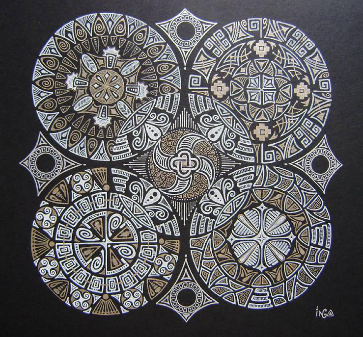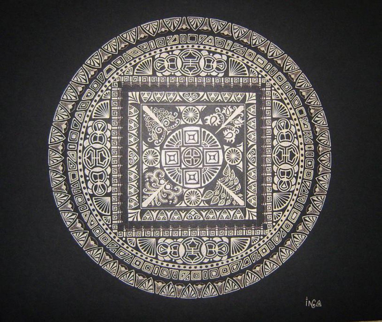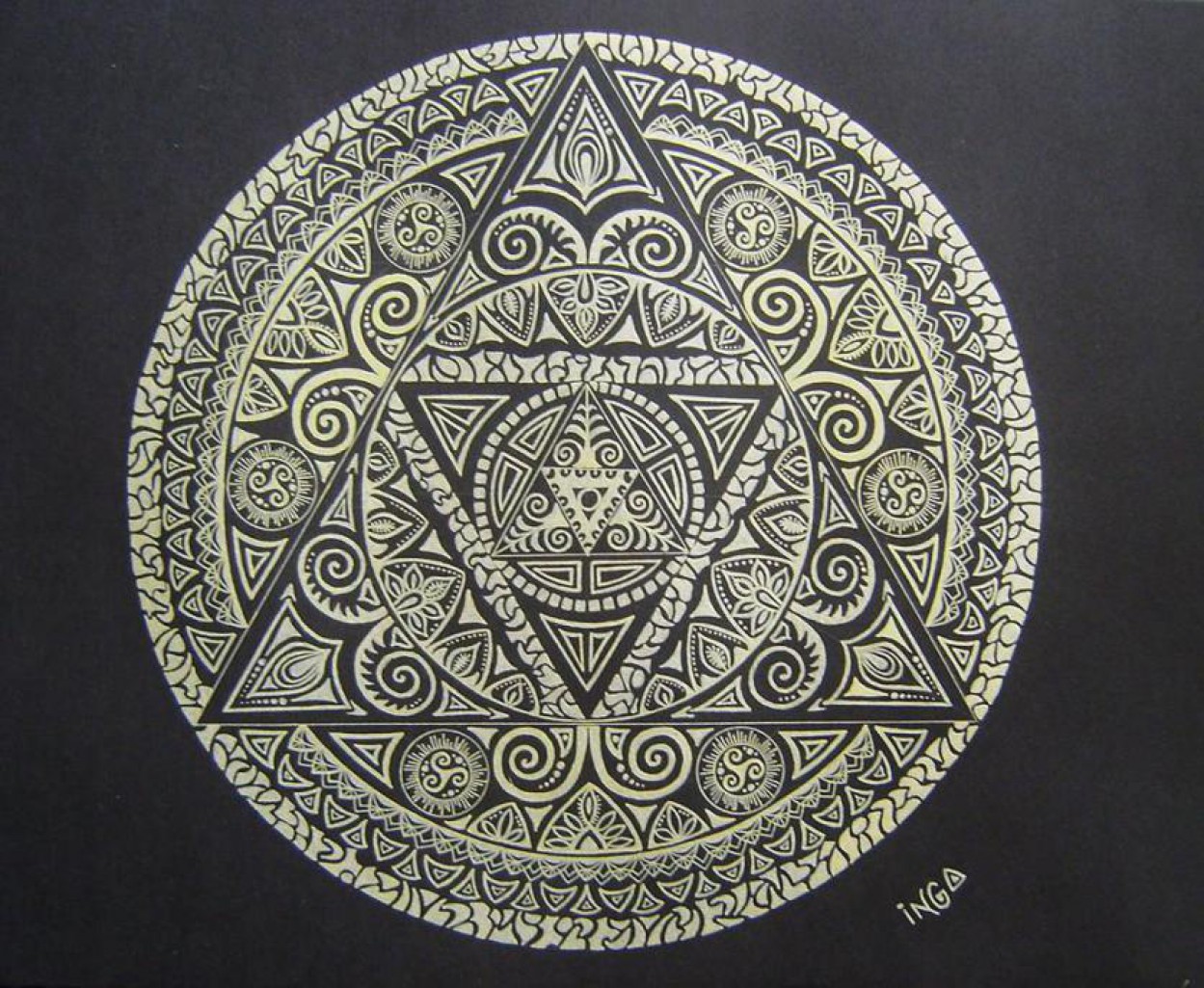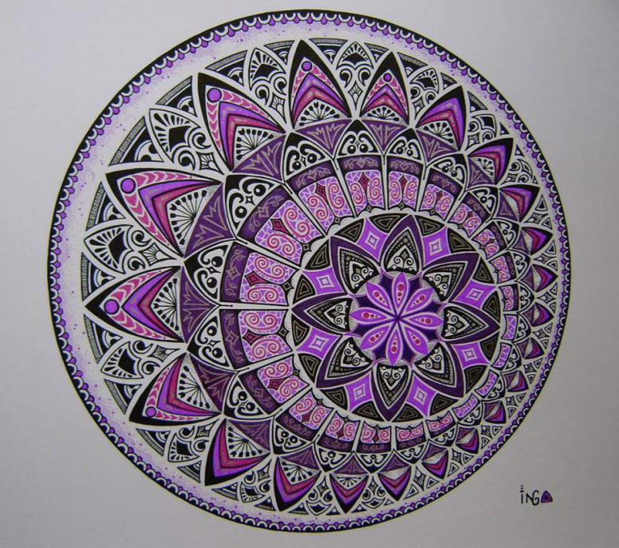 Tuo tarpu pati Inga pasirinko nespalvotų mandalų piešimo būdą, ir tik į kai kurias jų įmaišo po tris spalvas.