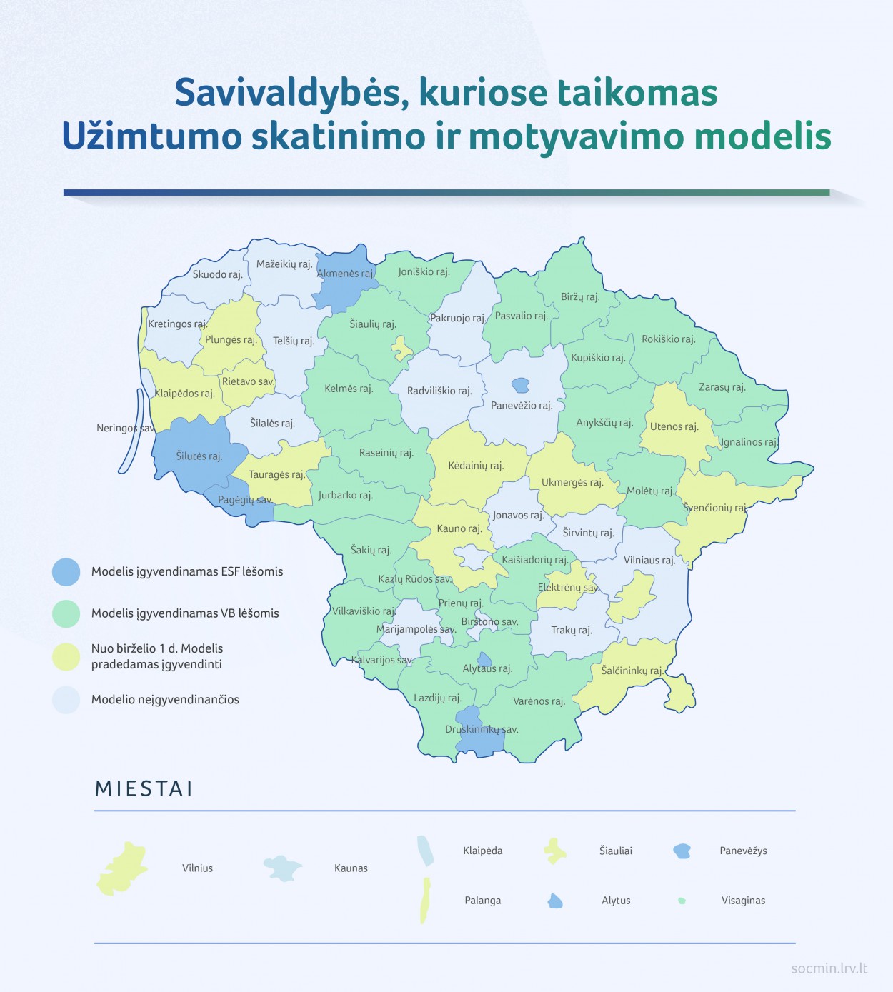 Užimtumo skatinimo ir motyvavimo paslaugų nedirbantiems ir socialinę paramą gaunantiems asmenims modelis sėkmingai įgyvendinamas 29 šalies savivaldybėse. Prie projekto prisijungiančioms naujoms savivaldybėms Socialinės apsaugos ir darbo ministerija skyrė apie pusę milijono eurų. Iš viso projekto įgyvendinimui šiemet skirta per 3 mln. eurų iš valstybės biudžeto. Šis projektas padės plėsti paslaugų ratą pažeidžiamiems žmonėms ir prisidės prie užimtumo sistemos pertvarkos šalyje įgyvendinimo.