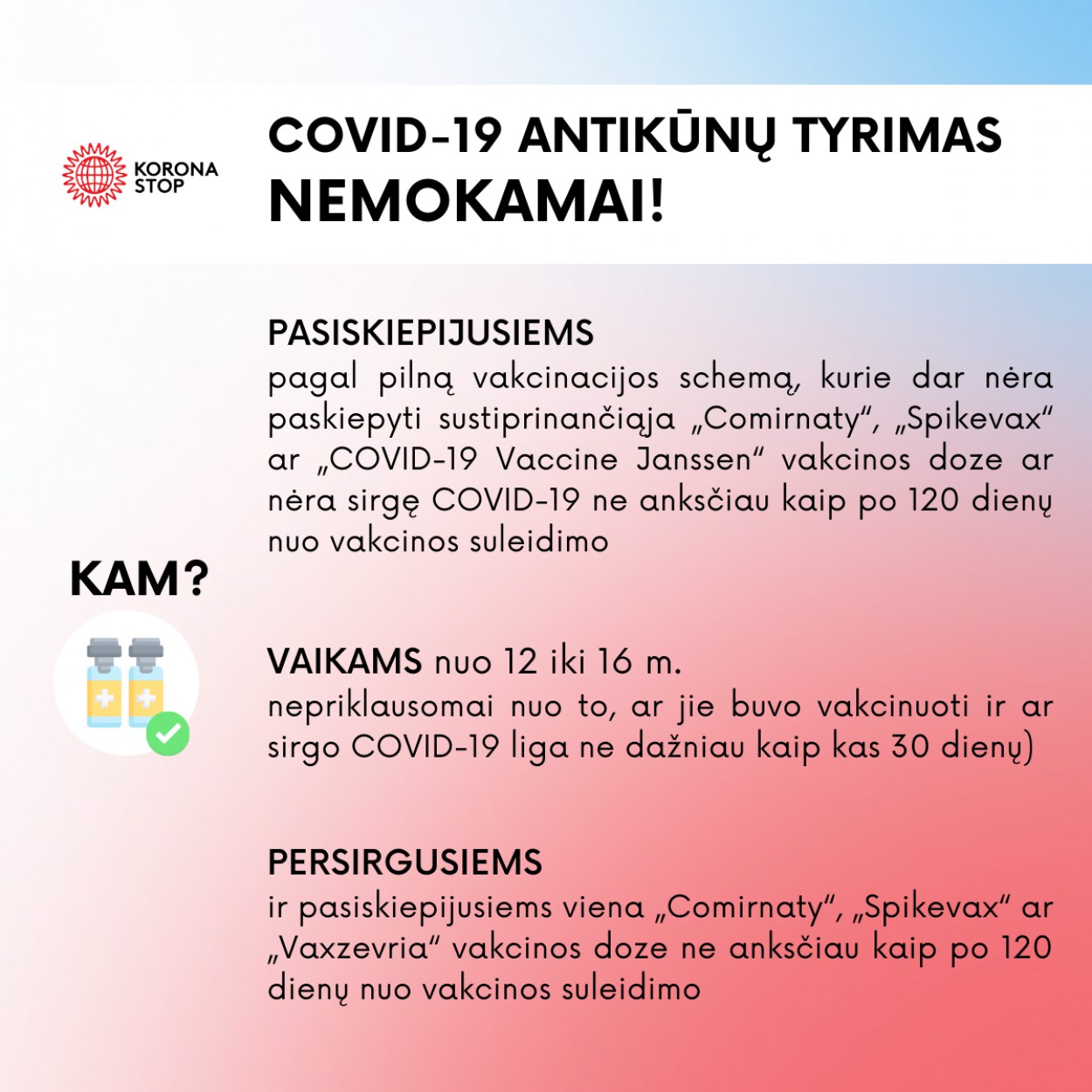 Vieną kartą nemokamas kiekybinis ar pusiau kiekybinis serologinis tyrimas ir toliau bus atliekamas asmenims, vakcinuotiems pagal pilną vakcinacijos schemą, kurie dar nėra paskiepyti sustiprinančiąja „Comirnaty“, „Spikevax“ ar „COVID-19 Vaccine Janssen“ vakcinos doze ar nėra sirgę COVID-19 (neturi diagnozės, patvirtintos teigiamu SARS-CoV-2 PGR tyrimo rezultatu). Serologinis tyrimas atliekamas ne anksčiau kaip po 120 dienų nuo vakcinos suleidimo.