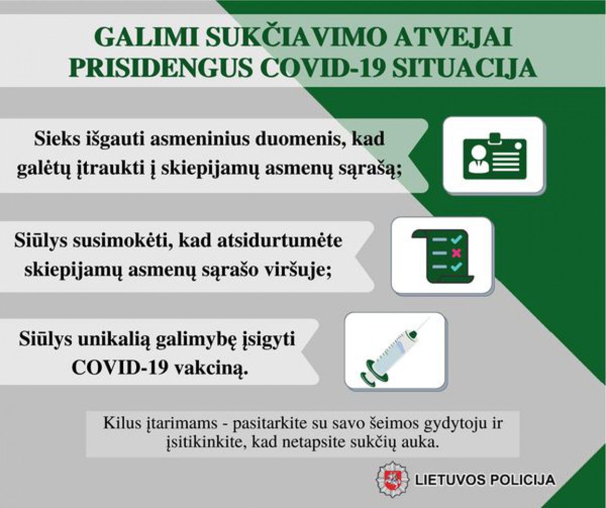 - Sukčiai gali siekti išgauti asmeninius duomenis aiškindami, jog šių reikia siekiant jus įtraukti į skiepijamų asmenų sąrašą;
