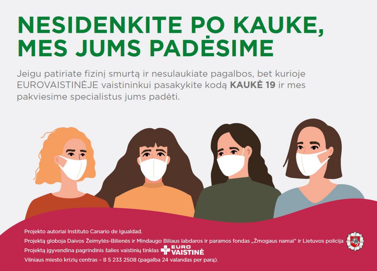 Antrojo karantino metu, kaip ir per pirmąjį karantiną, 20 proc. išaugo buitinių konfliktų skaičius. Šia informacija su visuomene pasidalinęs Lietuvos Policijos generalinis komisaras Renatas Požėla primena apie galimybę pagalbos ieškoti ir kiekvienoje „Eurovaistinėje“. Lapkričio pradžioje pristatyta kampanija, kurios tikslas – vaistinėje pasakius kodą Kaukė-19, smurtą artimoje šeimoje patiriantis asmuo gali sulaukti pagalbos.