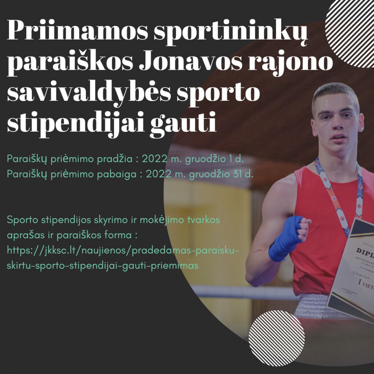 Jonavos sporto centras informuoja, kad nuo 2022 m. gruodžio 1 d. iki 2022 m. gruodžio 31 d. priimamos sportininkų paraiškos Jonavos rajono savivaldybės sporto stipendijai gauti. 2022 metais galimybę gauti sporto stitpendiją pasinaudojo 31 sportininkas.