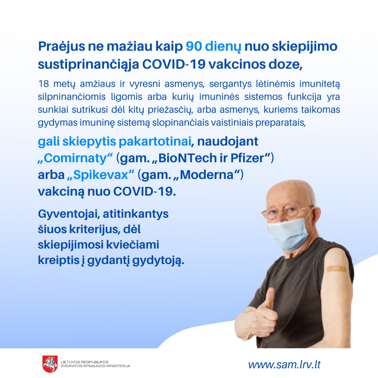 Kaip skelbia Sveikatos apsaugos ministerija (SAM) ketvirtąja COVID-19 vakcinos doze nuo pirmadienio gali pasiskiepyti visi pilnamečiai gyventojai, sergantys lėtinėmis imunitetą silpninančiomis ligomis arba kurių imuninės sistemos funkcija yra sunkiai sutrikusi dėl kitų priežasčių, taip pat asmenys, kuriems taikomas gydymas imuninę sistemą slopinančiais vaistais.