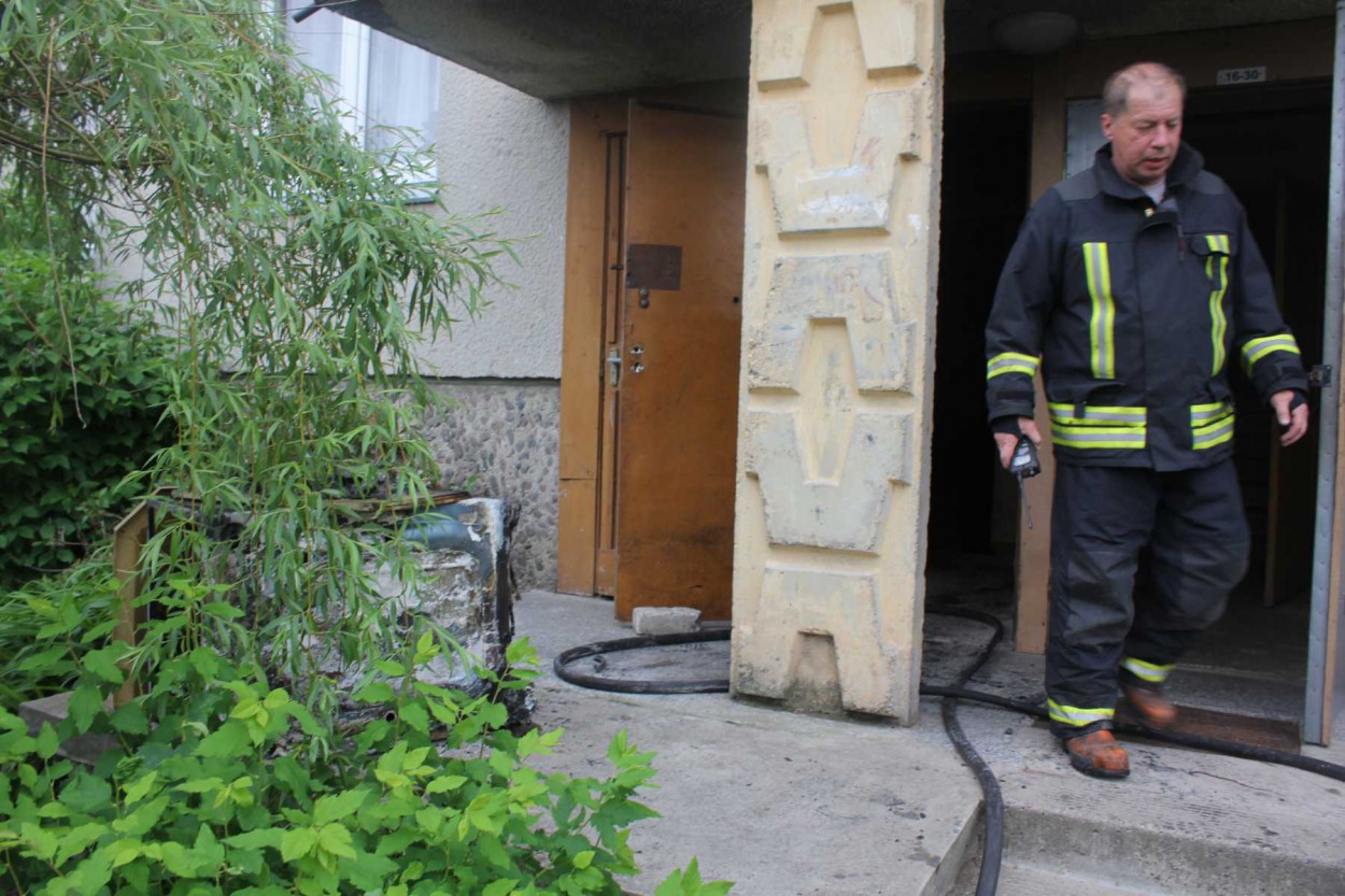 Iš rūsio ugniagesiai išnešė sudegusią skalbyklę. Manoma, kad gaisras greičiausiai galėjo būti sukeltas tyčia.