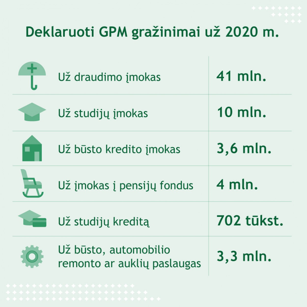 „Lengvata už patirtas automobilio, būsto remonto ir auklių paslaugas gyventojai galėjo pasinaudoti nuo 2020 m., kai deklaravo pajamas už 2019 m. Nuo 2022 m. lengvata nebegalioja, todėl šių metų deklaravimas – paskutinė galimybė susigrąžinti mokesčius už 2021 m. patirtas išlaidas“, - teigia VMI atstovas. Iki šios dienos 13 tūkst. gyventojų deklaravo grąžintiną 1,6 mln. eurų GPM sumą už šias paslaugas, o per du praėjusius metus tai spėjo padaryti 46 tūkst. gyventojų, kurie susigrąžino 6,3 mln. eurų.