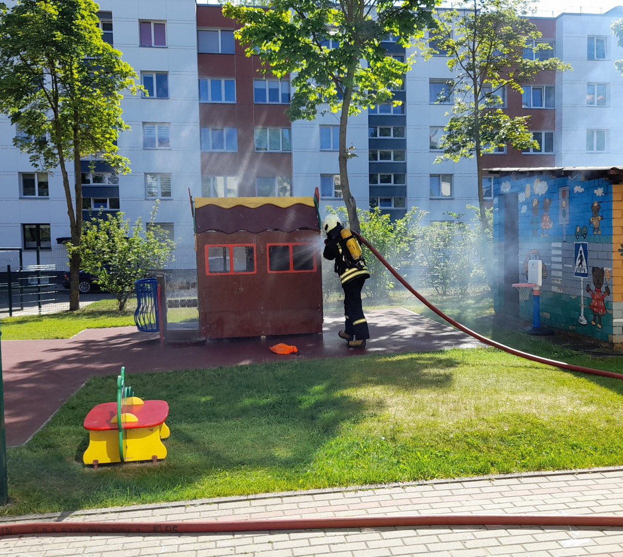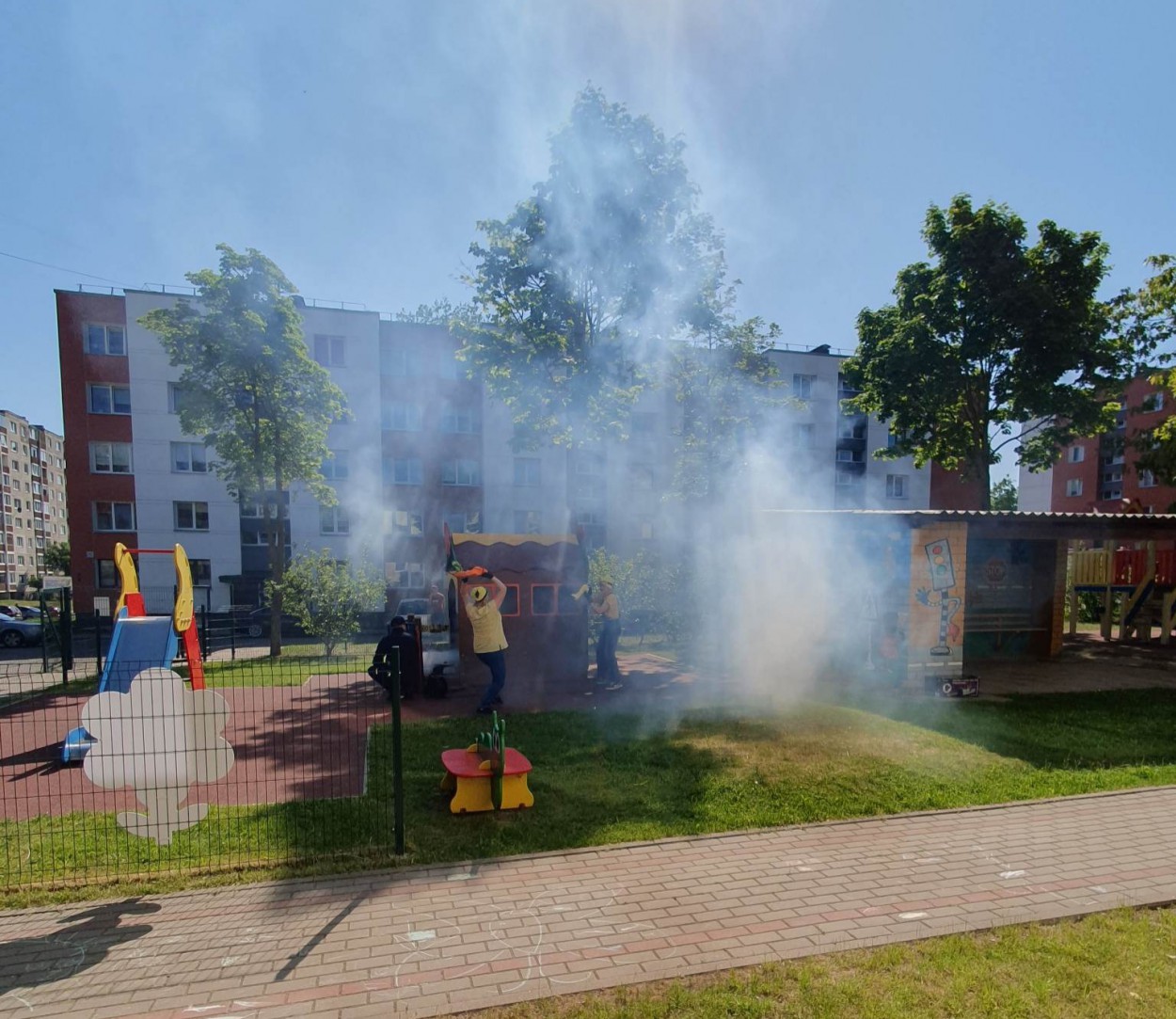 „Pakalikai“ darželio kieme padegė žaidimų namelį ir susižeidė sprukdami paspirtukais. Visa laimė, kad tai buvo tik imitacija, mokomosios pratybos, kuriomis siekėme atkreipti ypatingą dėmesį į darželinio amžiaus vaikų saugumą, ypač dviratininkų, paspirtukininkų, pėsčiųjų, apsaugant nuo nelaimingų atsitikimų keliuose, žaidžiant laisvalaikiu, primenant eismo saugumo taisykles bei atsakomybę vietos bendruomenei.