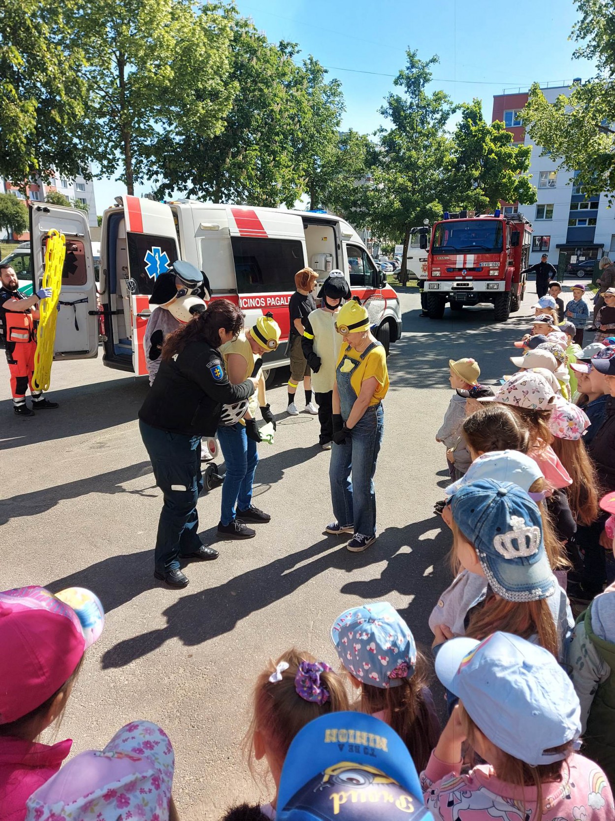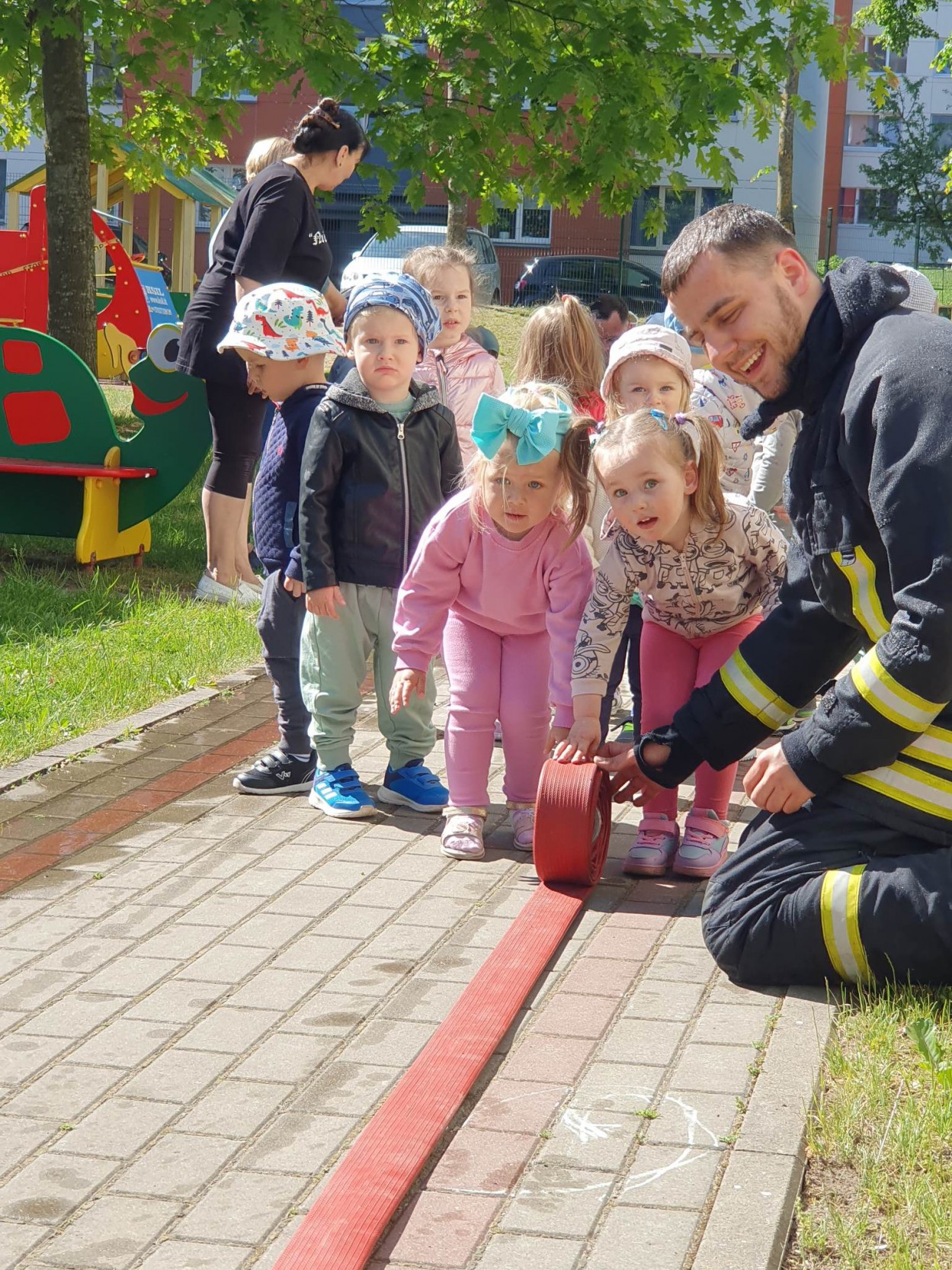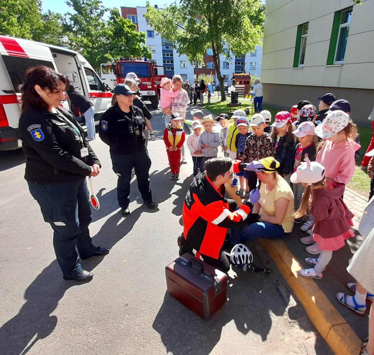 Pagalbos tarnybų atstovai noriai talkino darželio bendruomenei organizuojant prevencinę-projektinę dieną ,,Saugus ‒ tai laimingas” ir kantriai dalijosi savo profesinėmis žiniomis su mažaisiais darželio ugdytiniais.