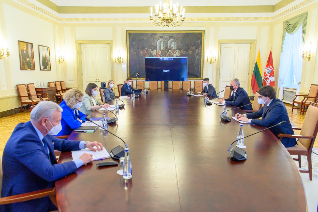 Pirmadienį Lietuvos Respublikos Prezidentas Gitanas Nausėda, susitikęs su finansų ministre Gintare Skaiste, ekonomikos ir inovacijų ministre Aušrine Armonaite, vidaus reikalų ministre Agne Bilotaite, Seimo Valstybės valdymo ir savivaldybių komiteto pirmininku Ričardu Juška, Lietuvos universitetų rektorių konferencijos prezidentu prof. Eugenijumi Valatka, Lietuvos savivaldybių asociacijos prezidentu Mindaugu Sinkevičiumi, aptarė Ekonomikos gaivinimo ir atsparumo didinimo planą.