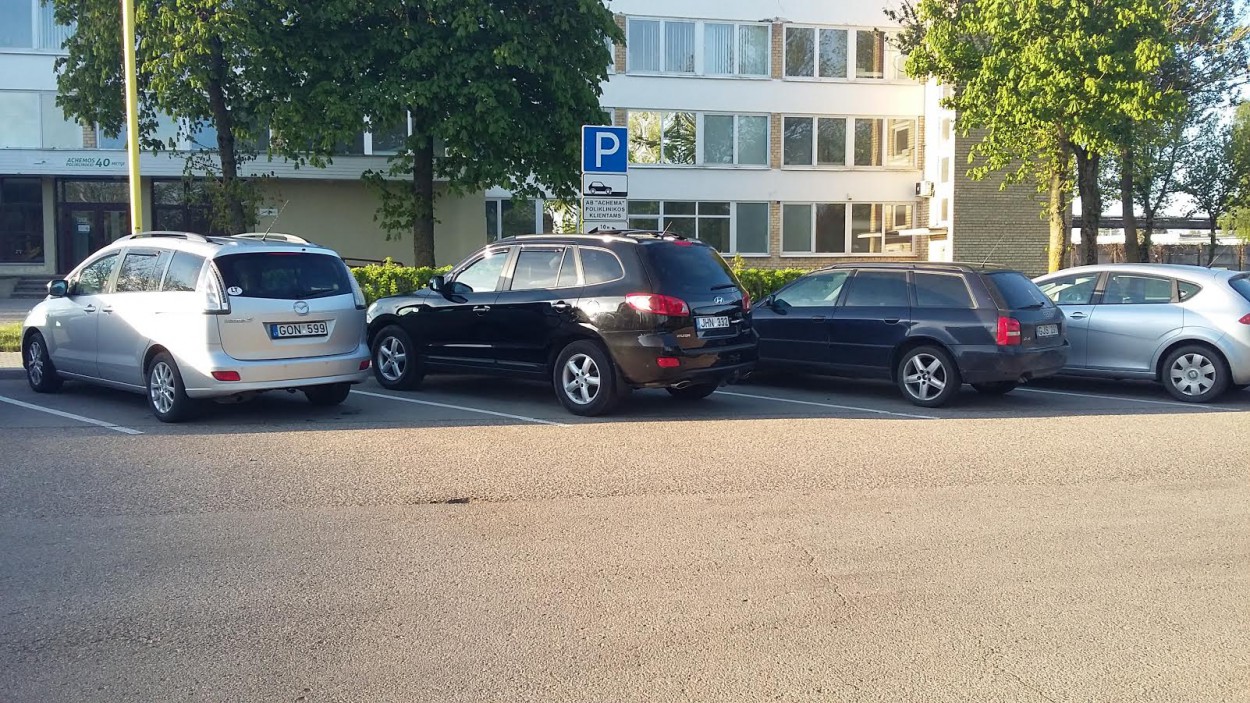 „Iš ryto, apie 6.45 val. nuvažiavus į „Achemos“ polikliniką štai ką radau – pridedu nuotraukas. Greta esančioje informacinėje lentelėj parašyta, kad vietos skirtos „Achemos“ poliklinikos pacientams. Tačiau tokiu laiku poliklinika buvo tuščia, o aikštelė – pilna.