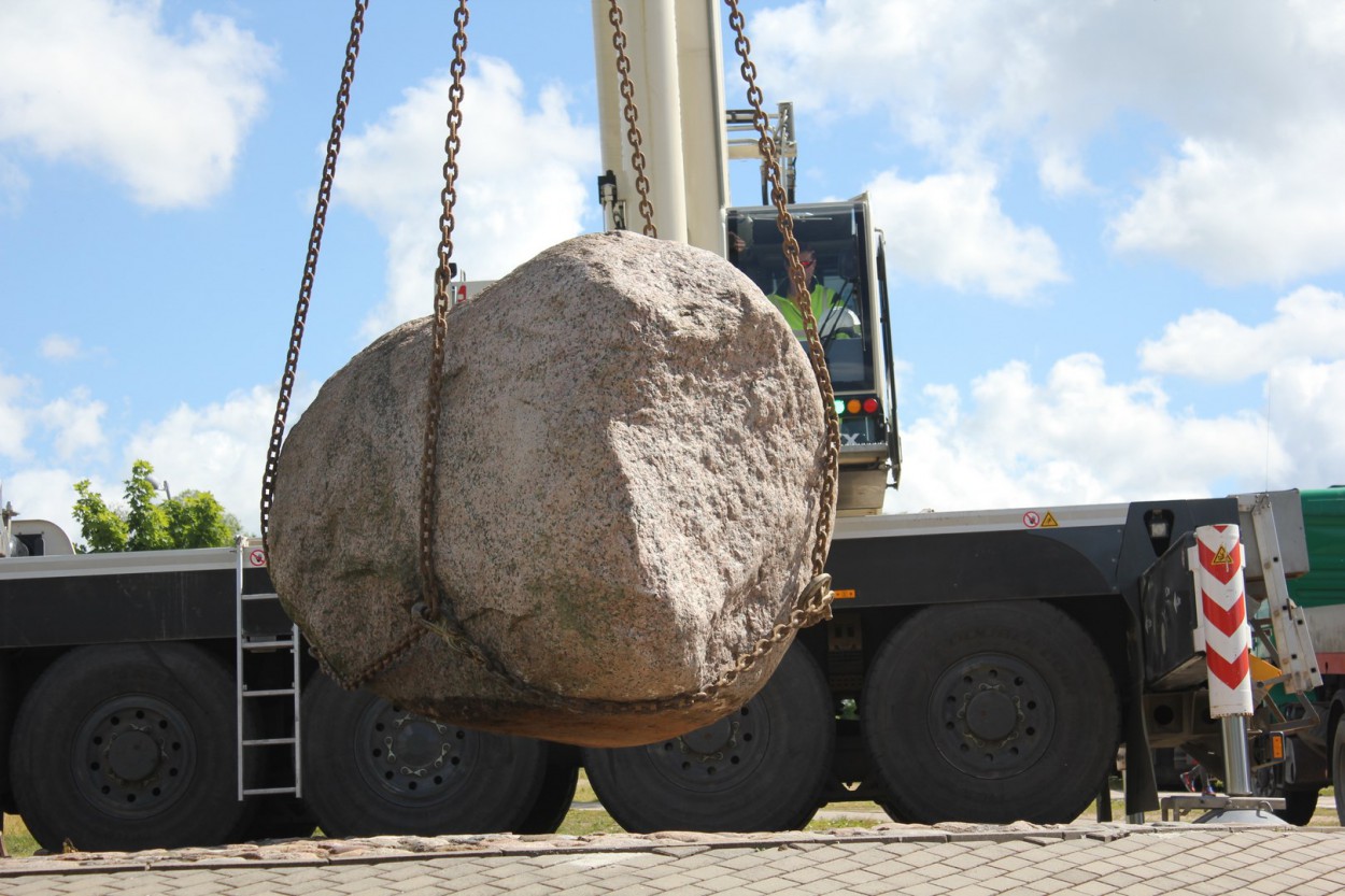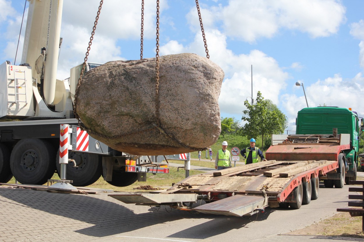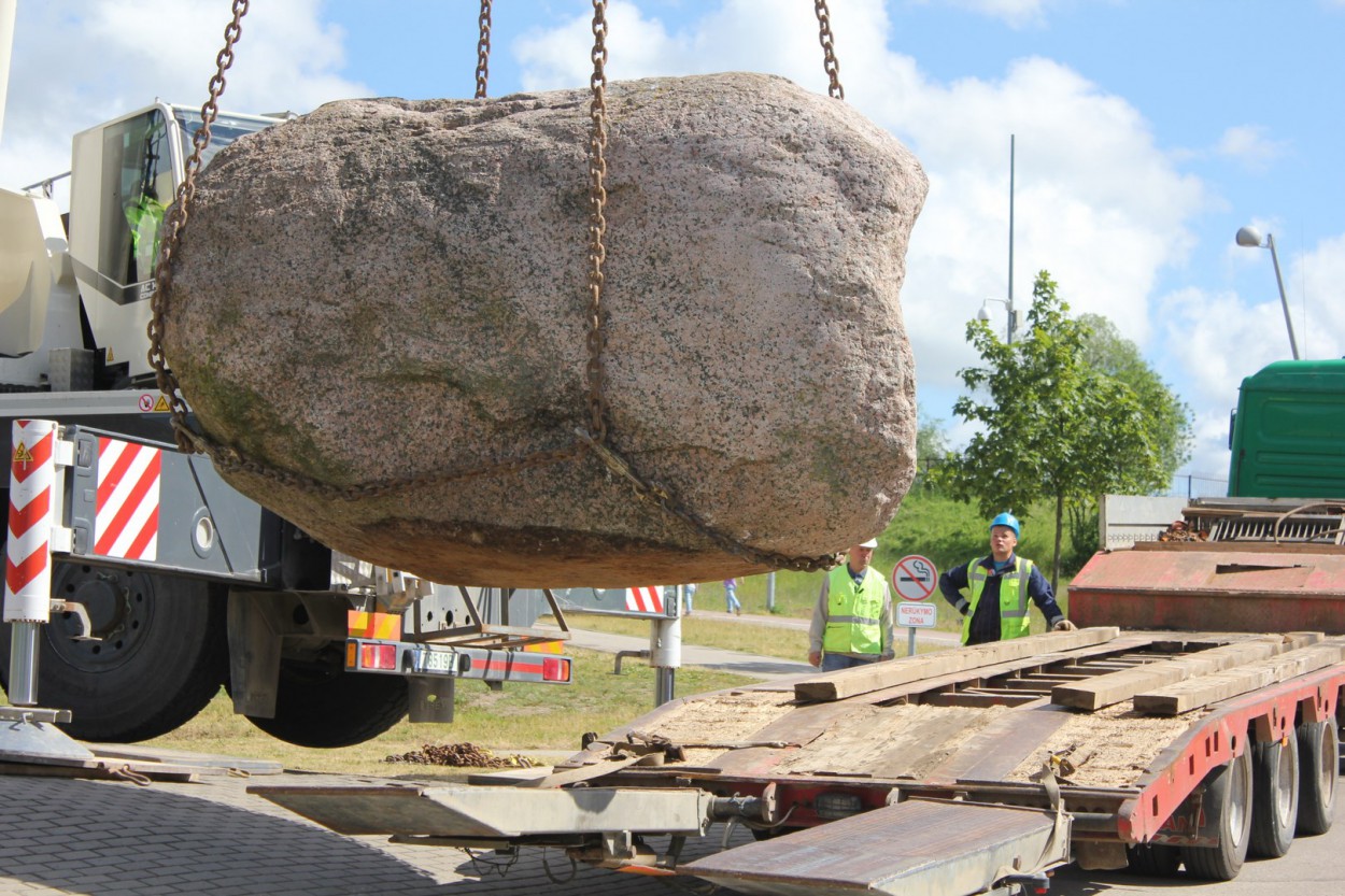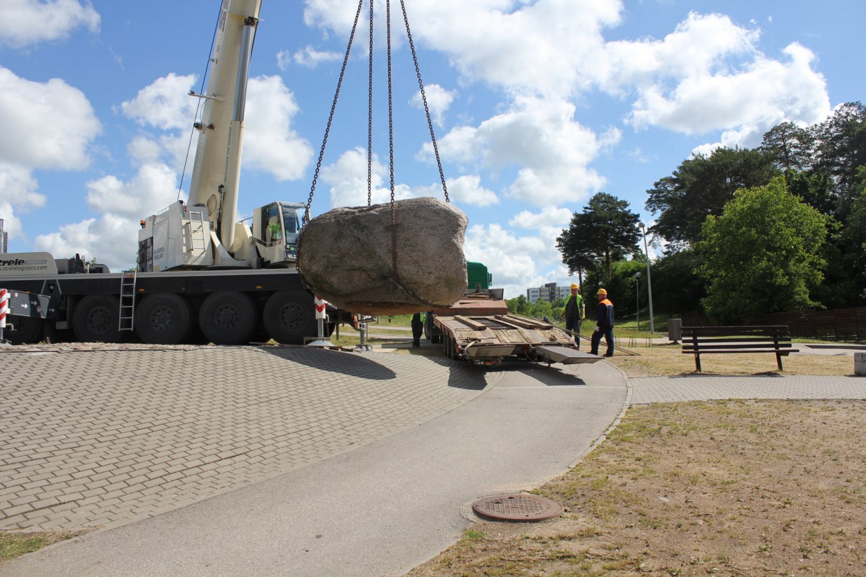 Pirmadienio rytą bendrovės „Mažeikių strėlė“ darbininkai nukėlė prie Joninių slėnio buvusį akmenį ir jį pergabeno į kitą vietą.