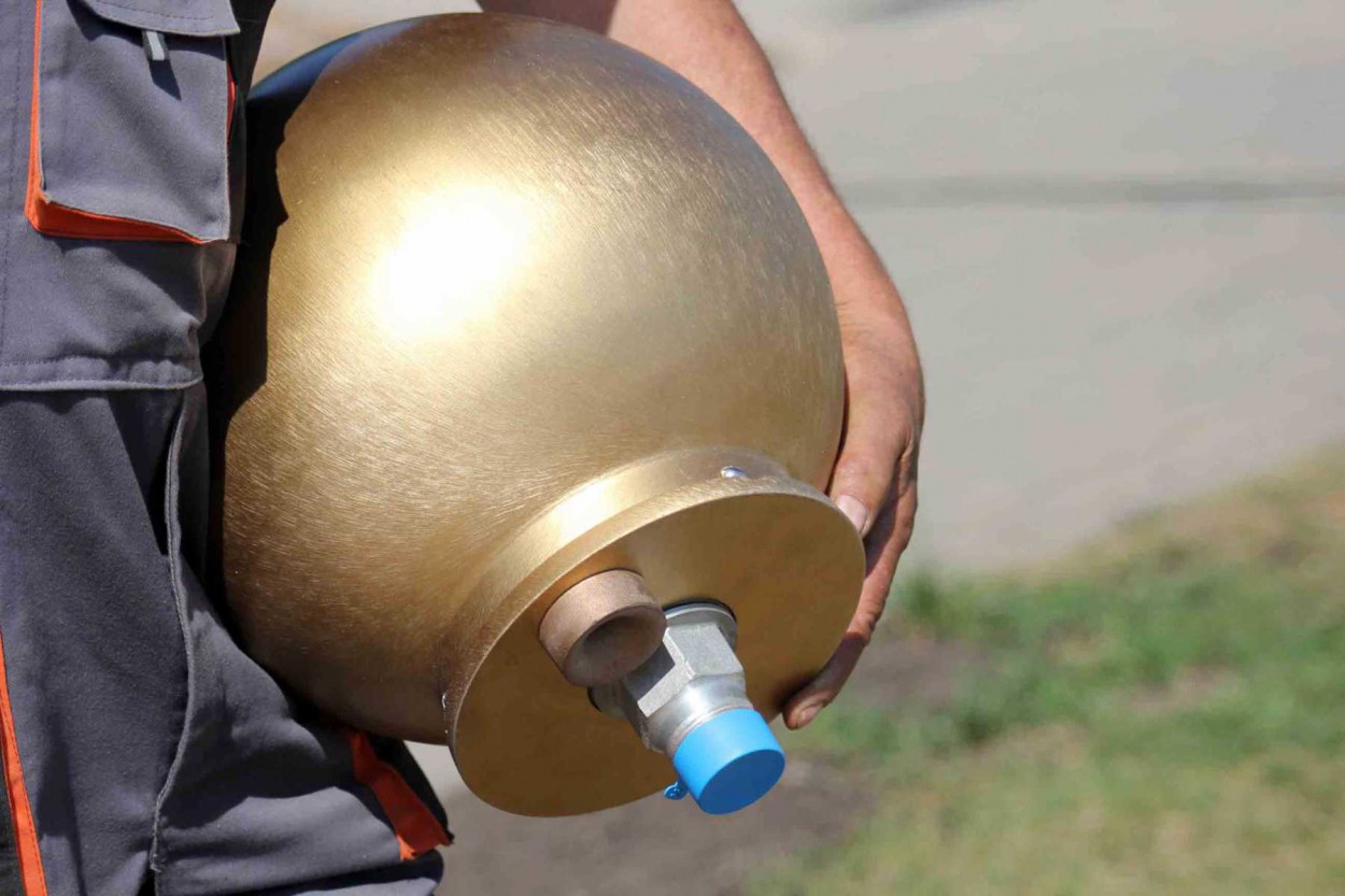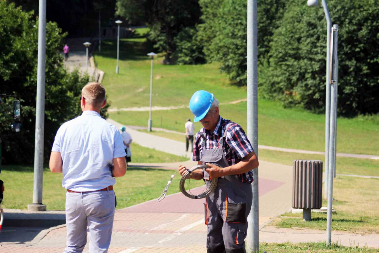 Metalinį stiebą buvusioje akmens vietoje įrenginėja įmonės „Egsta“ darbininkai.