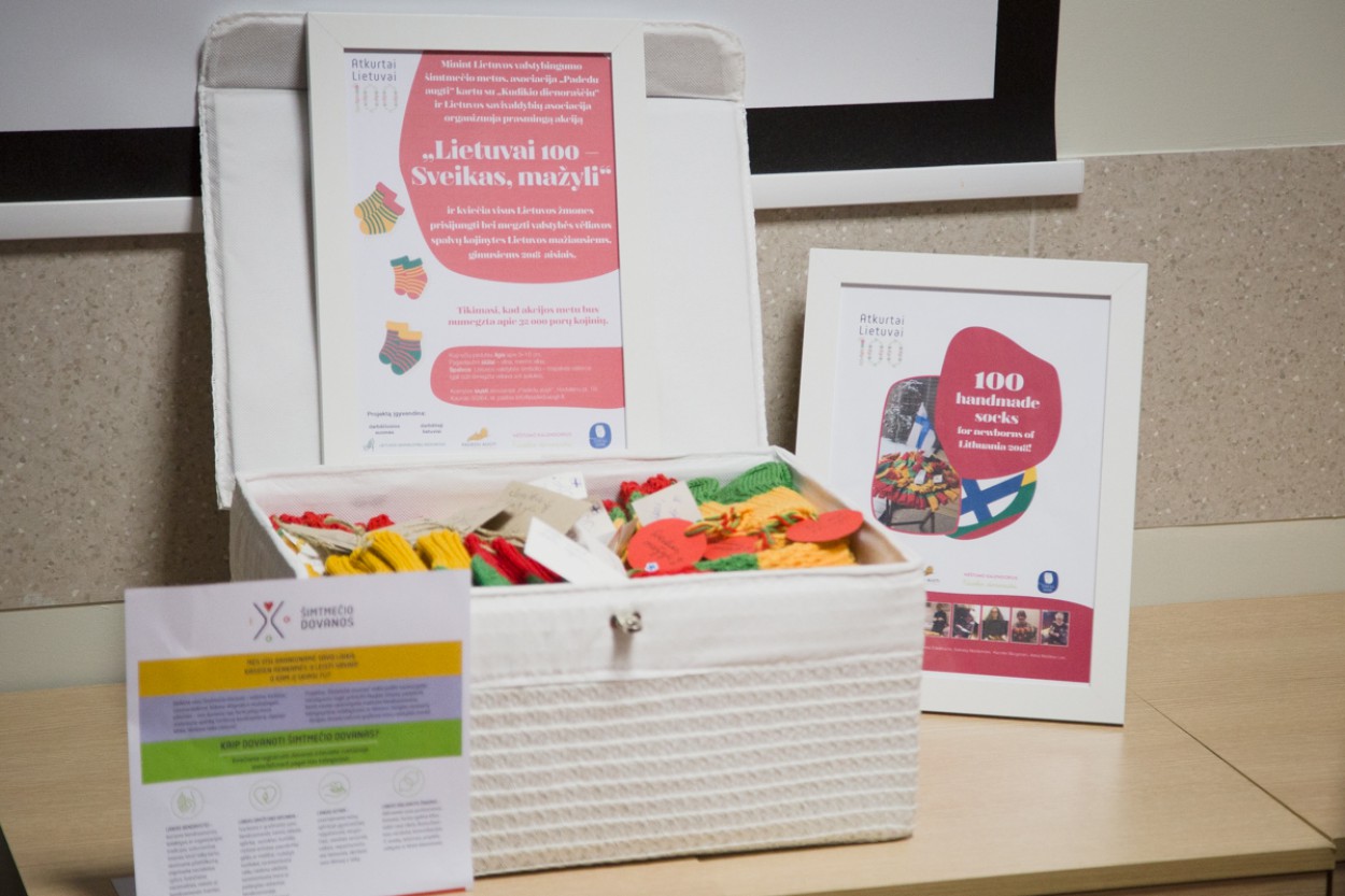 Santaros klinikų Akušerijos ir ginekologijos centrui buvo įteikta išskirtinė dovana – 100 suomių moterų rankomis numegztų trispalvių kojinaičių šimtmečio naujagimiams. Taip startavo Suomijos ambasados remiama Lietuvos valstybės atkūrimo šimtmečiui skirta akcija - „Sveikas, mažyli – Lietuvai 100“.