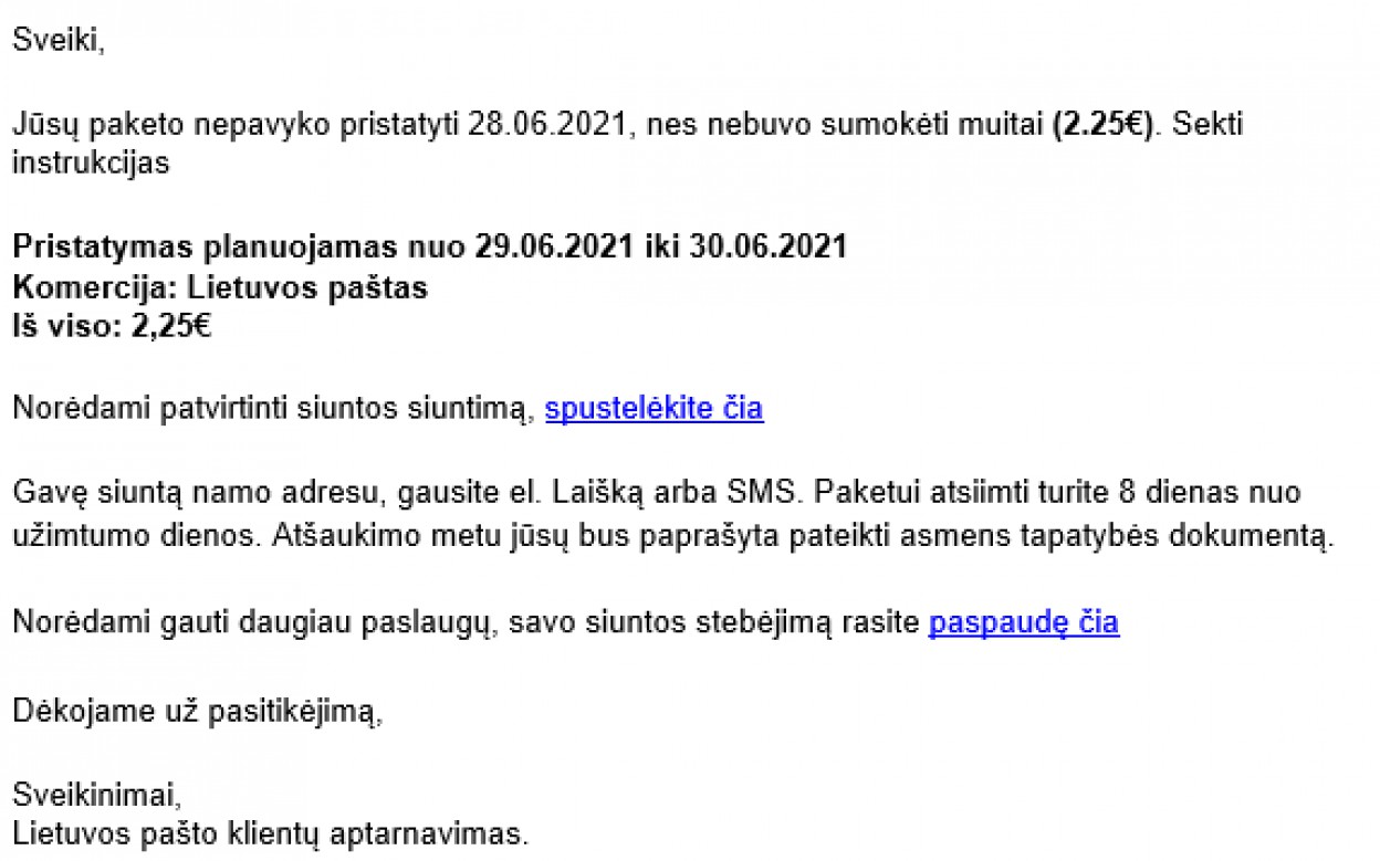 Atkreipiame dėmesį, kad šie laiškai yra apgaulė. Visą informaciją apie savo siuntas galite sekti Lietuvos pašto internetiniame puslapyje arba prisijungę prie savo paskyros Lietuvos pašto savitarnoje.
