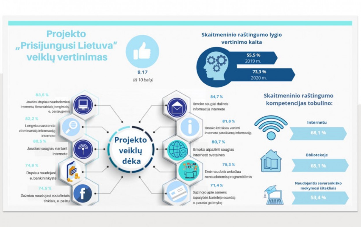 Prieš trejus metus Informacinės visuomenės plėtros komiteto su partneriais pradėtas vykdyti projektas „Prisijungusi Lietuva: efektyvi, saugi ir atsakinga Lietuvos skaitmeninė bendruomenė” („Prisijungusi Lietuva“) išsikėlė ambicingą tikslą – padėti gyventojams išmokti veiksmingai, saugiai, atsakingai naudotis informacinėmis technologijomis bei internetu ir jo teikiamomis galimybėmis. Finišo tiesiąją projektas pasiekė tikrai labai džiuginančiais rezultatais – projekte naudotis informacinėmis ir ryšių technologijomis (IRT) mokėsi daugiau negu 104 tūkst. Lietuvos gyventojų, o visose projekto veiklose dalyvavo per 500 tūkst. žmonių.