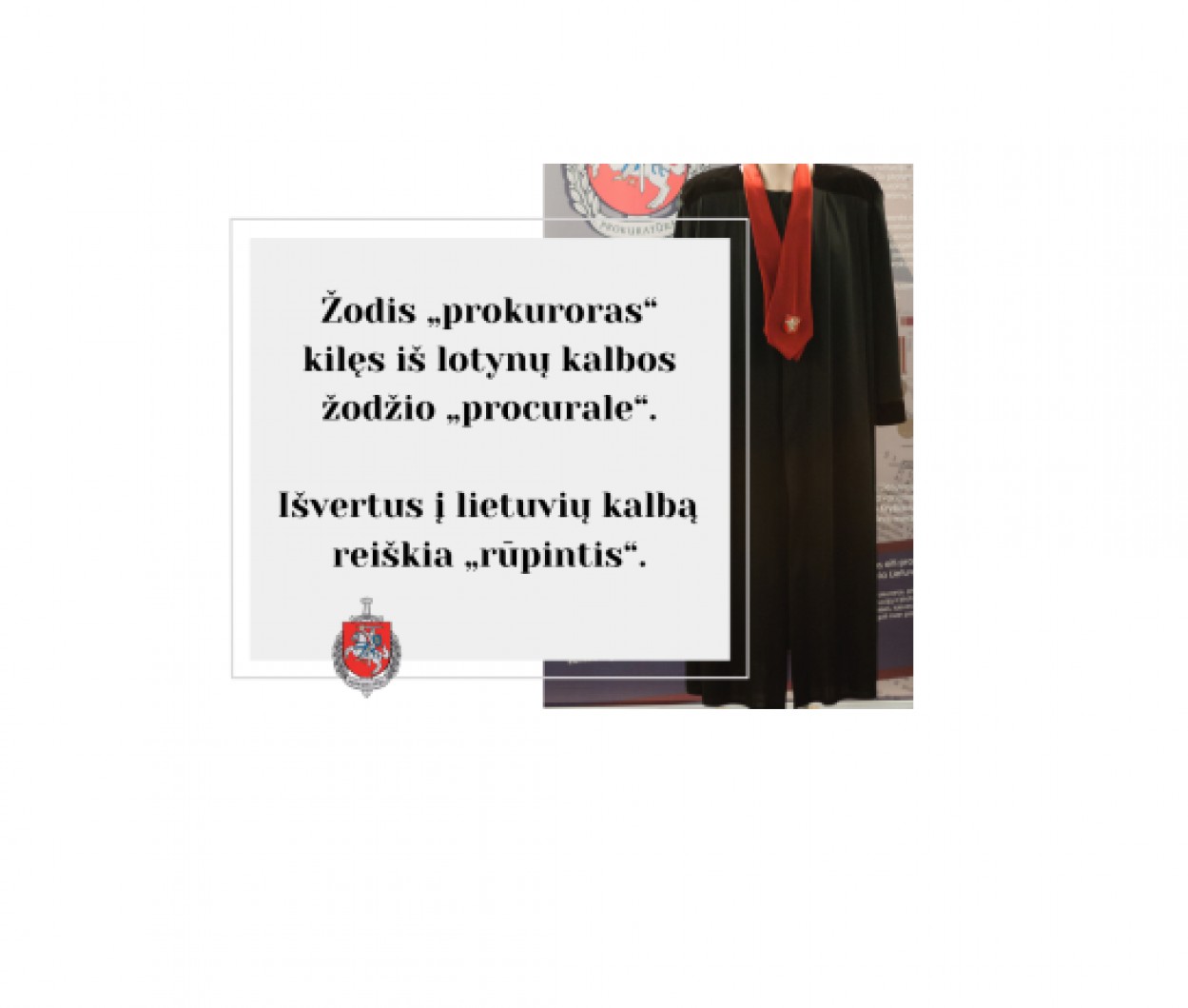 - žodis „prokuroras“ kilęs iš lotynų kalbos žodžio „procurale“, išvertus į lietuvių kalbą reiškia „rūpintis“;