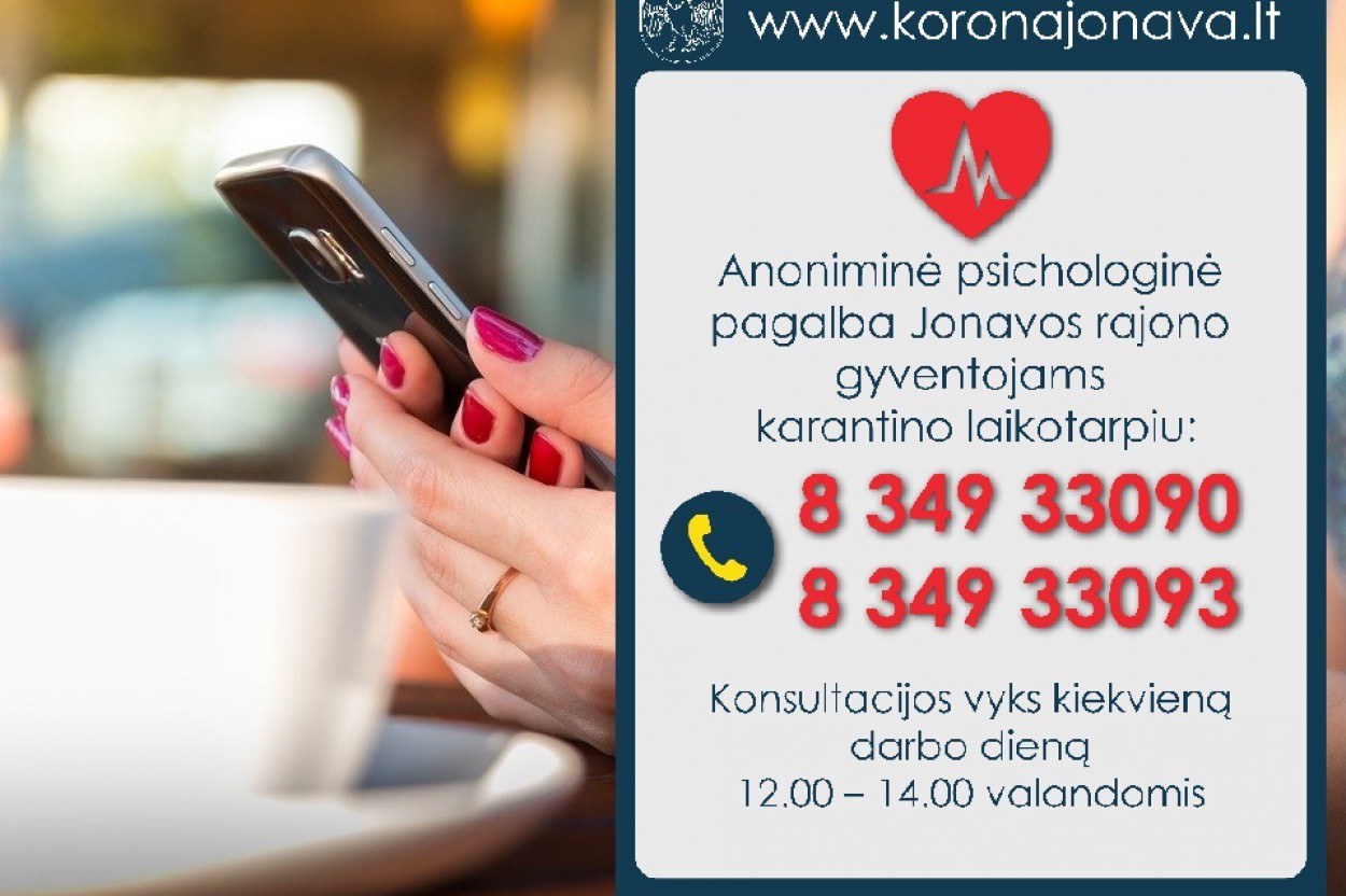 Pranešame, kad karantino laikotarpiu VšĮ Jonavos PSPSC psichikos sveikatos centro psichologai teiks psichologinę pagalbą Jonavos miesto ir rajono gyventojams be išankstinės registracijos ir anonimiškai. Norint gauti anoniminę psichologo konsultaciją skambinkite telefonais: 8 349 33090, 8 349 33093. Konsultacijos vyks kiekvieną darbo dieną 12.00 – 14.00 valandomis.
