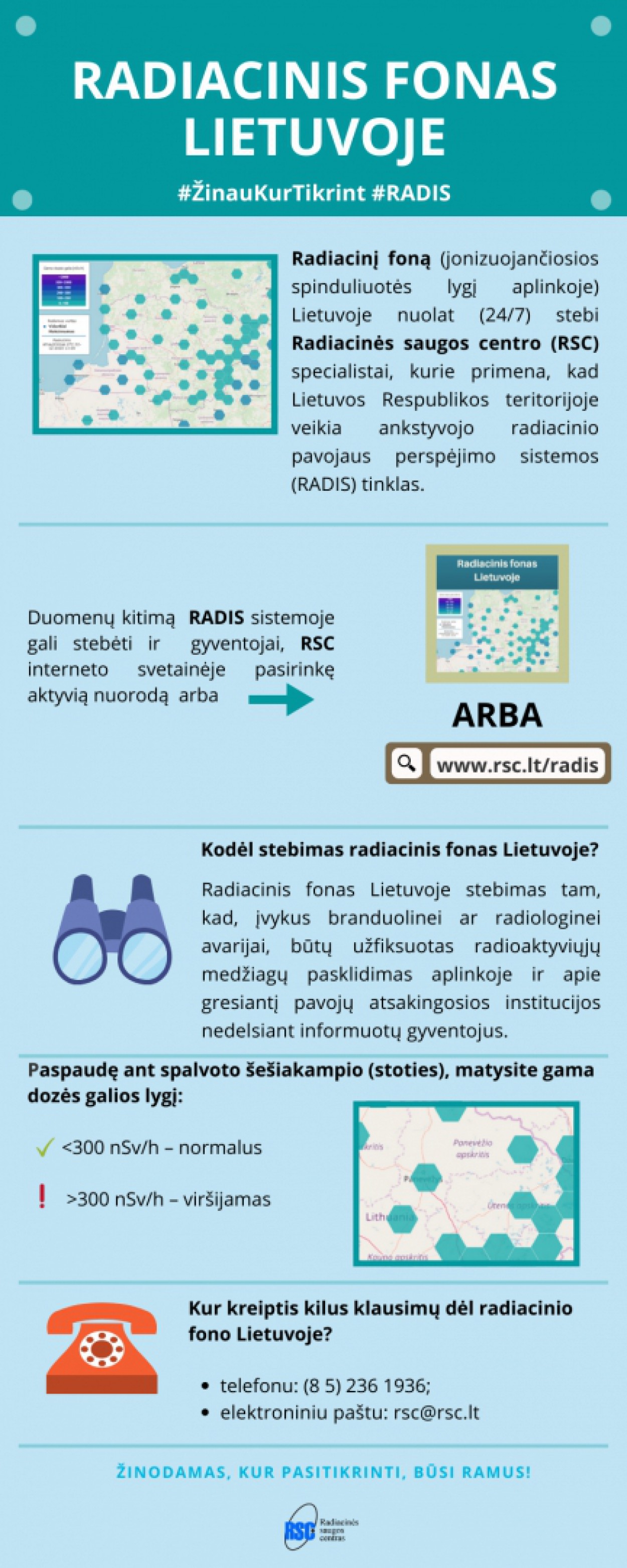 Primenama, kad radiacinio fono Lietuvoje stočių teikiamų duomenų kitimą gali stebėti kiekvienas gyventojas šioje nuorodoje -> www.rsc.lt/radis, taip pat radiacinio fono matavimų Lietuvoje apžvalgą galite stebėti čia.