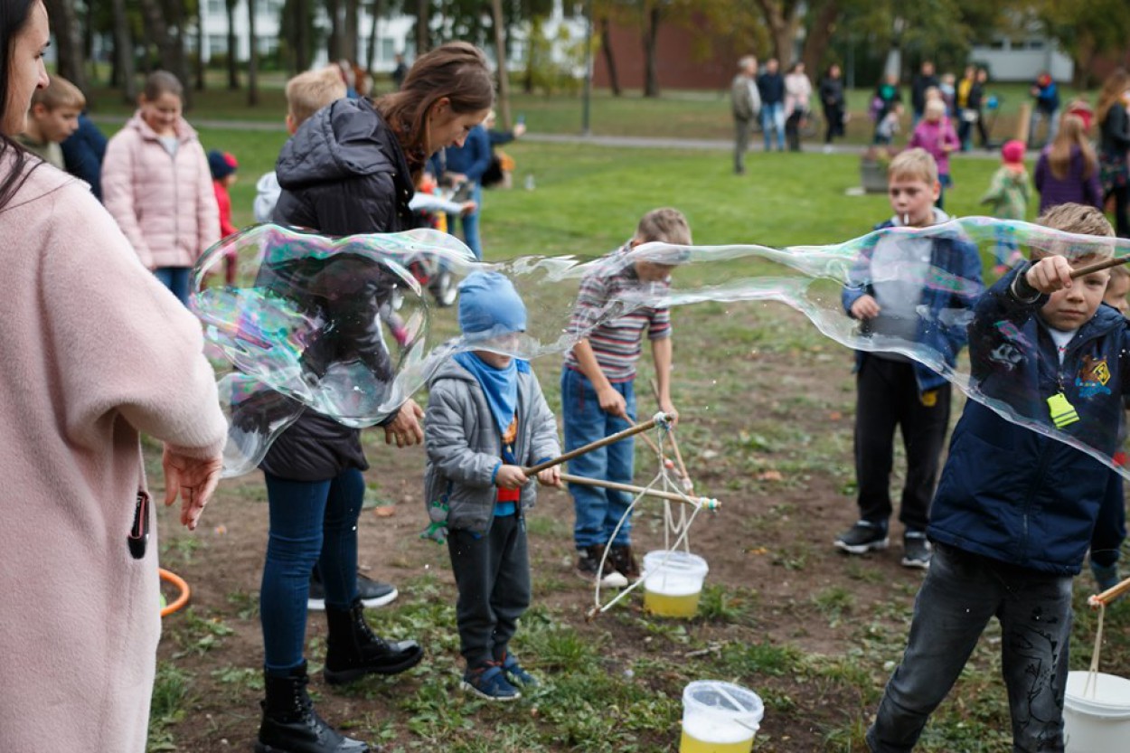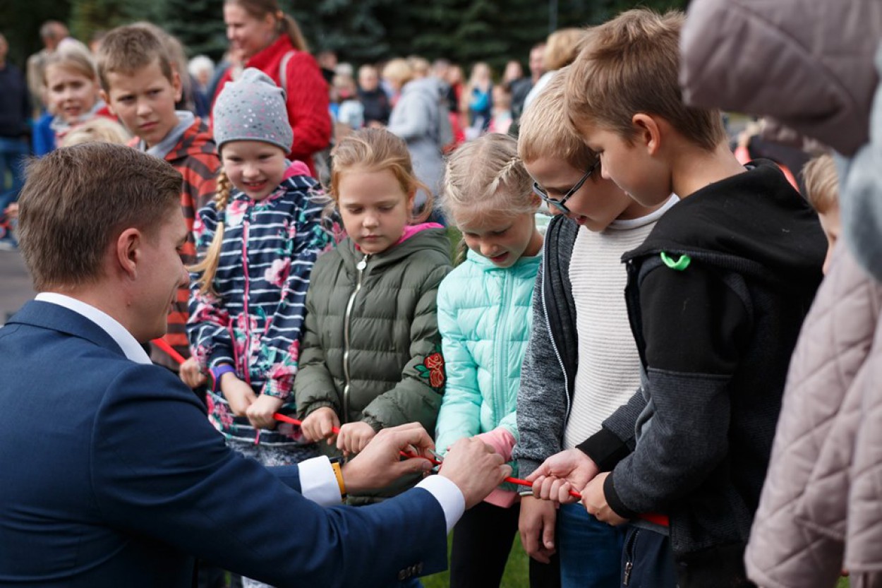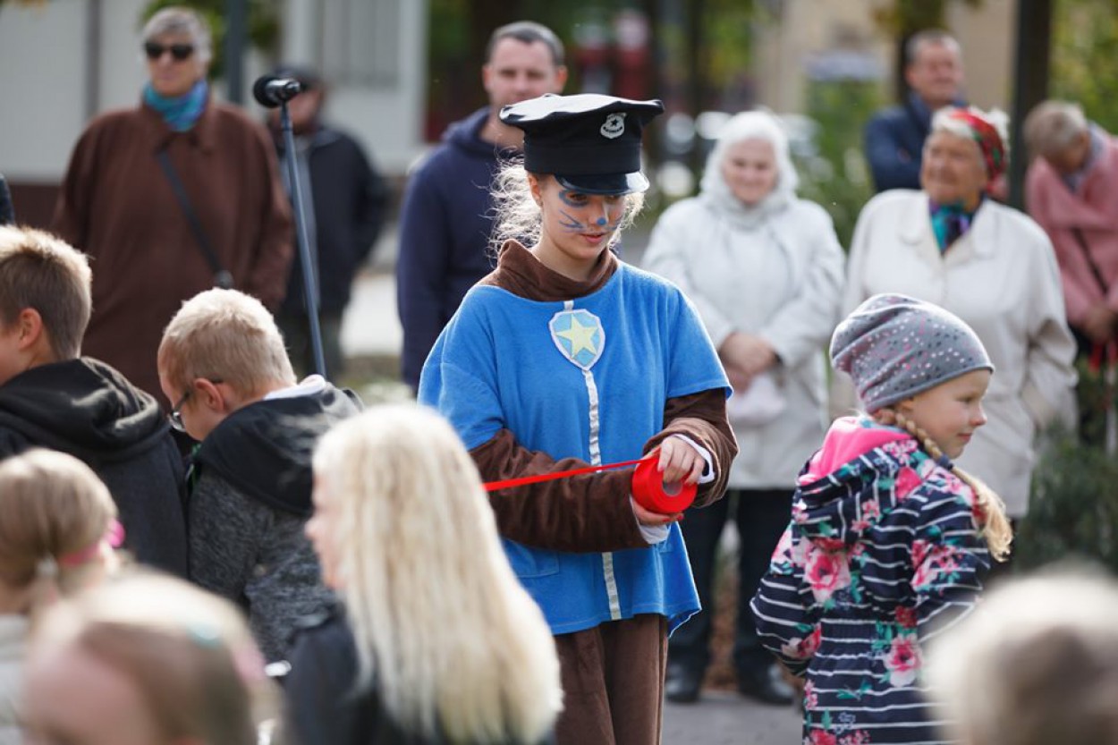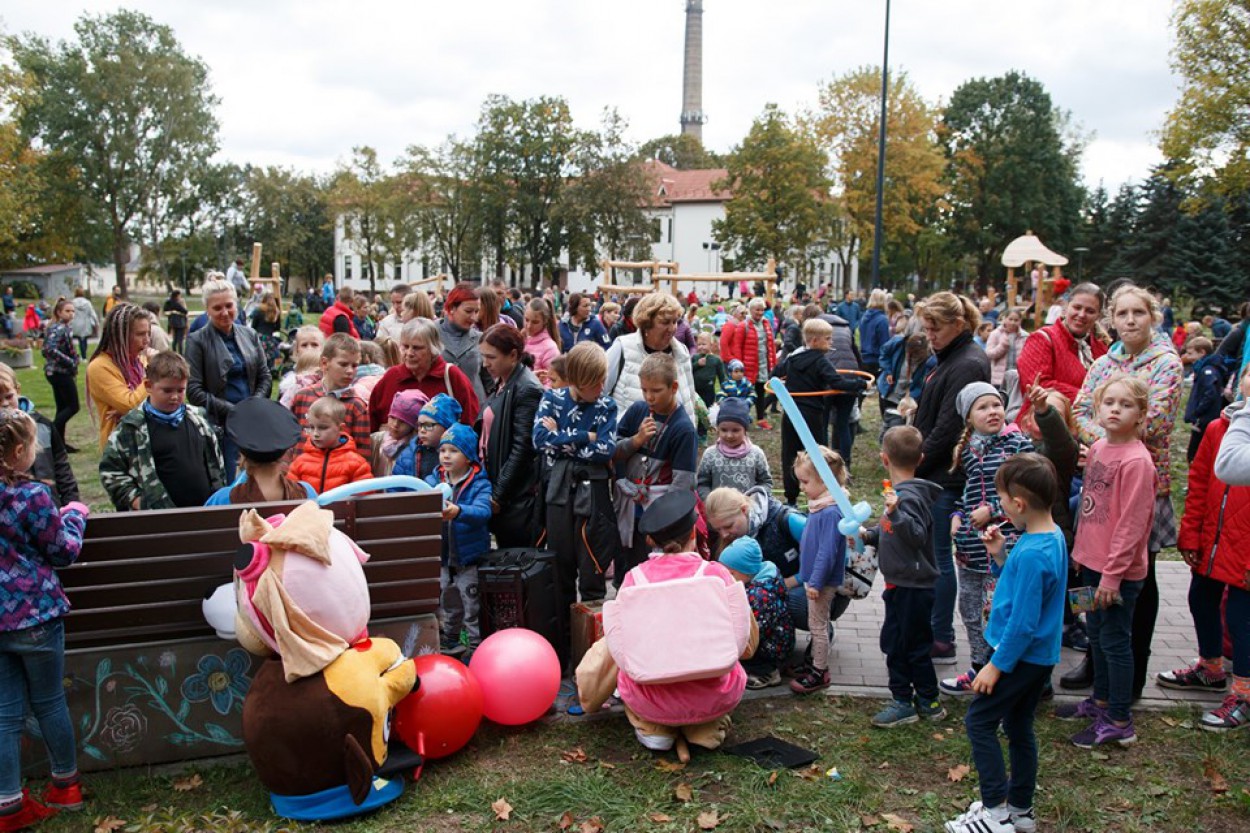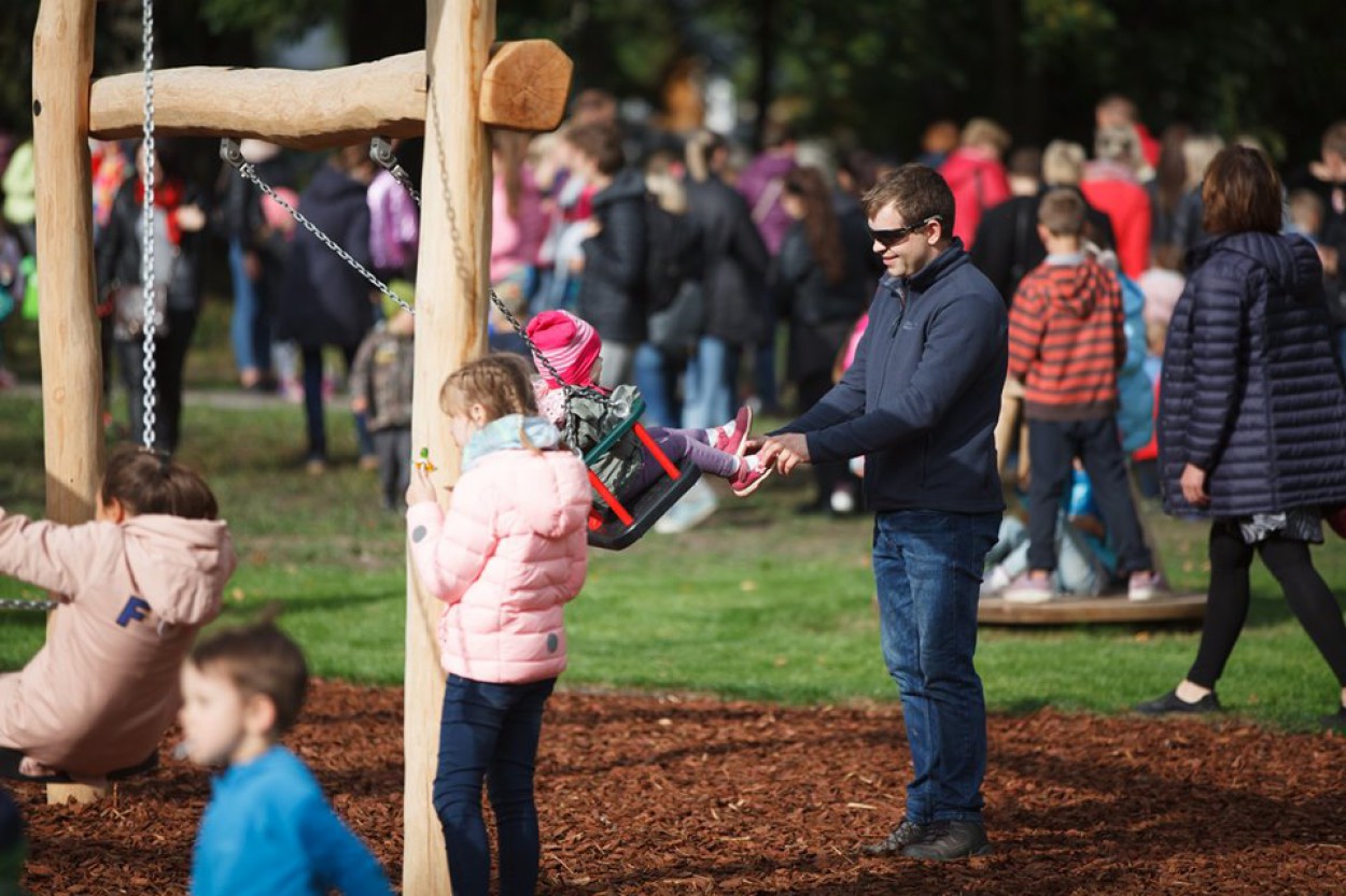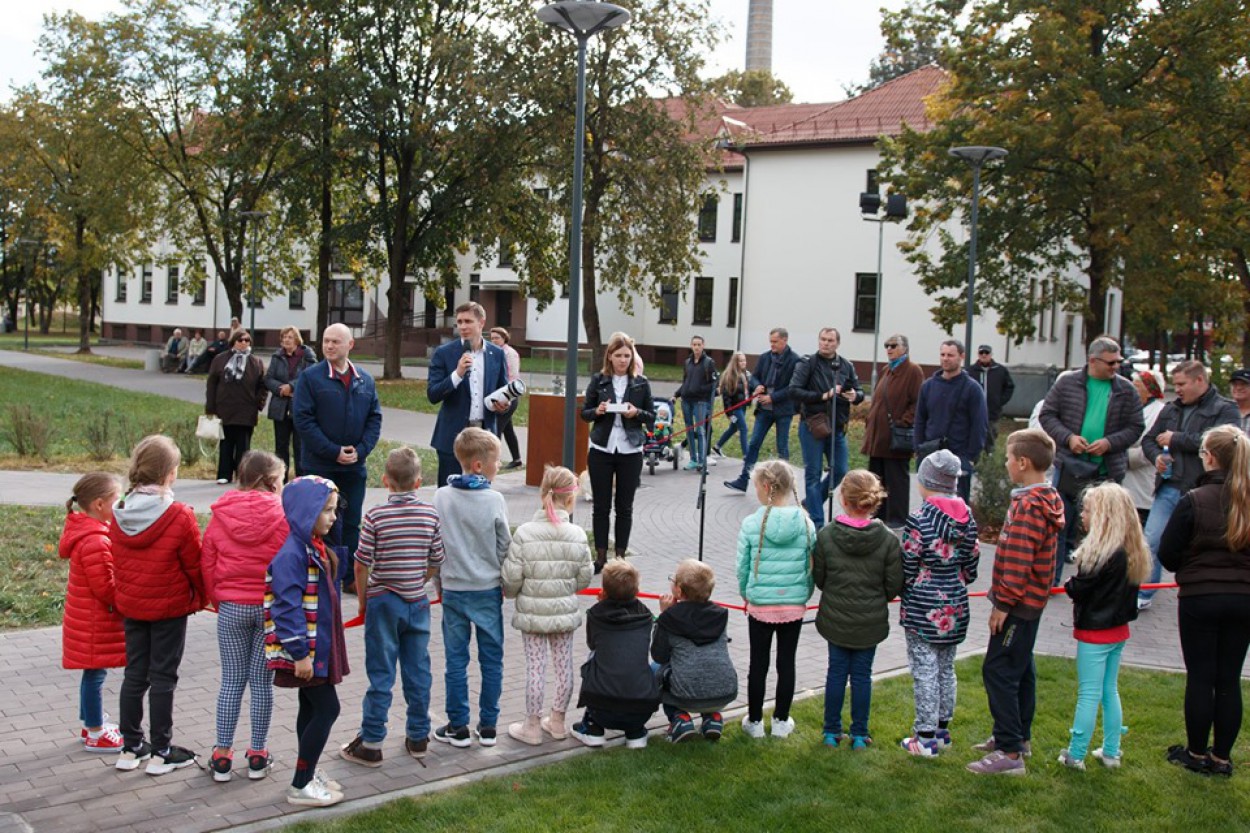 Jonavos centre, Ramybės skvere, sekmadienį atidaryta nauja vaikų žaidimų aikštelė, į kurios atidarymą susirinko didelis būrys mažųjų su mamomis ir tėčiais.