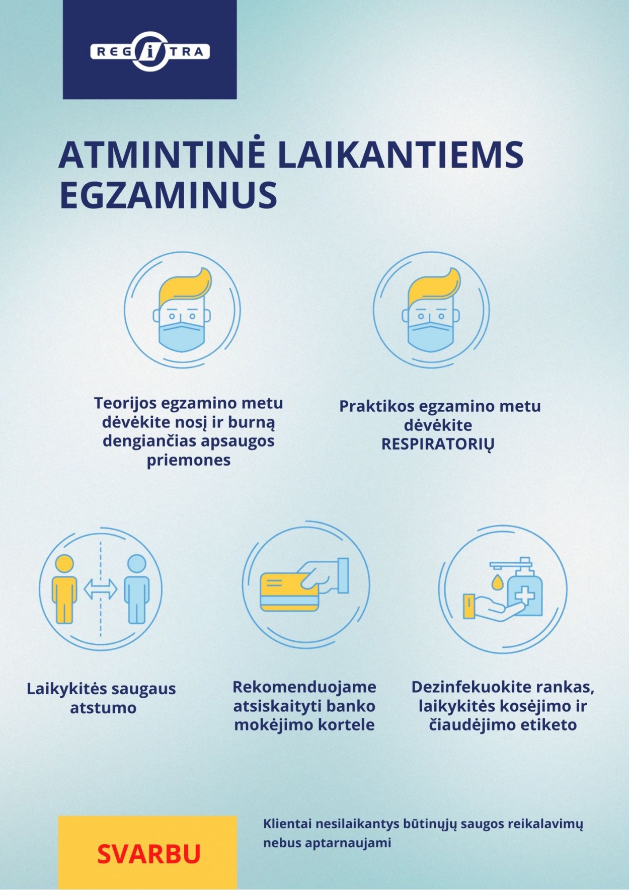 Taip pat būsimų vairuotojų, kaip ir visų kitų klientų, atvykus į „Regitros“ padalinį prašoma laikytis šių bendrųjų saugumo reikalavimų: dezinfekuoti rankas, laikytis saugaus atstumo ir, jei yra galimybė, už paslaugas atsiskaityti banko mokėjimo kortele. Prieš prasidedant egzaminui būsimų vairuotojų taip pat bus prašoma pasirašyti ir patvirtinti, jog jie neturi ligos simptomų bei jiems netaikoma izoliacija dėl koronaviruso infekcijos.