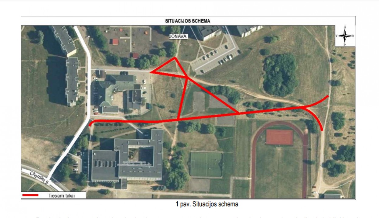 Numatoma pėsčiųjų dviračių tako trasa veda per suformuotą žemės sklypą Chemikų g. 140, kuriame įsikūrusi Jonavos Raimundo Samulevičiaus progimnazija ir prisijungia prie esamo pėsčiųjų dviračių tako šalia žemės sklypo Chemikų g. 138.