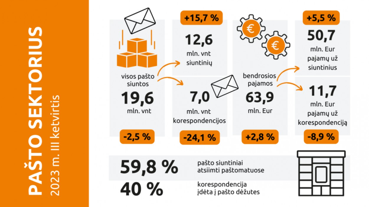 Pajamos, gautos už pašto siuntinių pristatymą, siekė 50,7 mln. Eur ir buvo 5,5 proc. didesnės, palyginti su 2022 m. III ketv., bet tik 1,0 proc. didesnės nei 2023 m. II ketv.