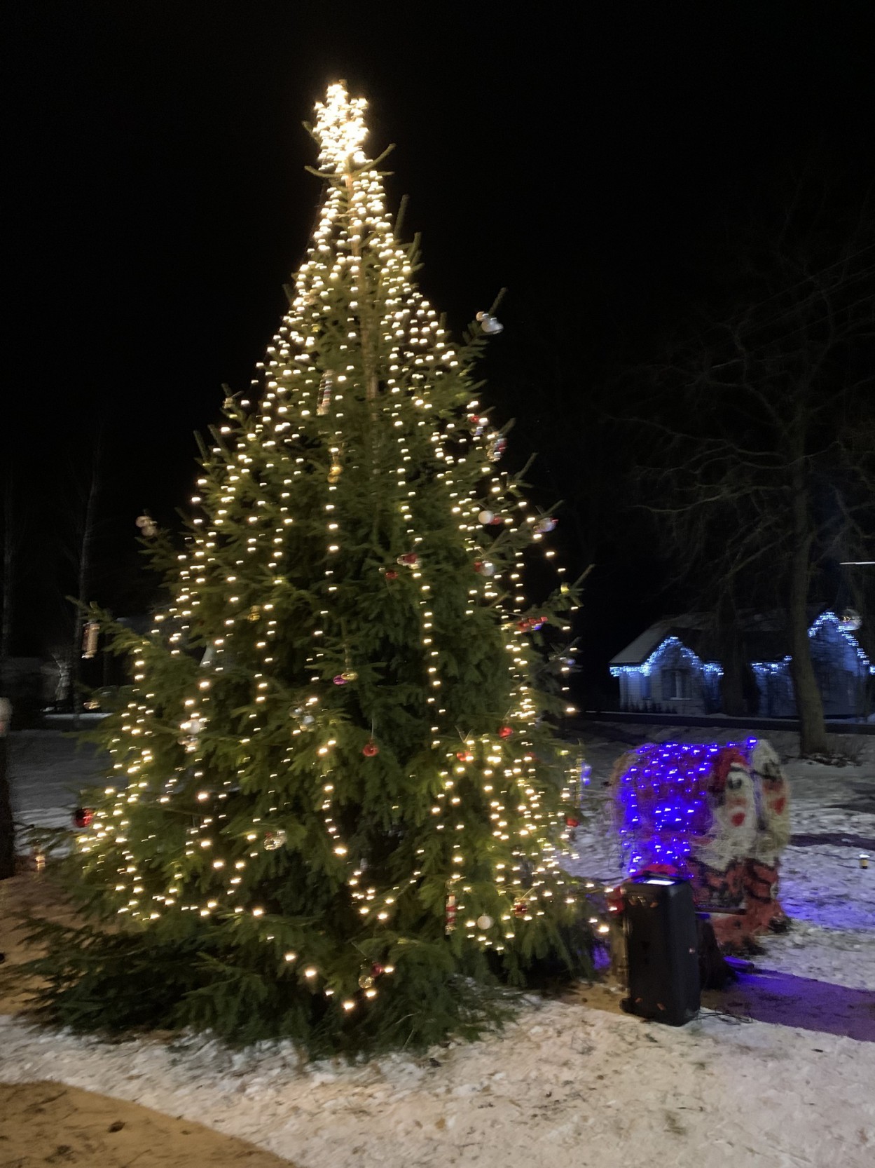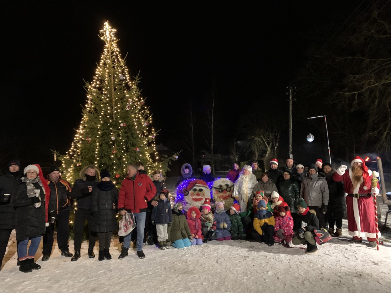Jaukiai apšviesta eglutė ateinančias kelias savaites džiugins gyventojus ir pagrindine kaimo gatve pravažiuojančius keliautojus.